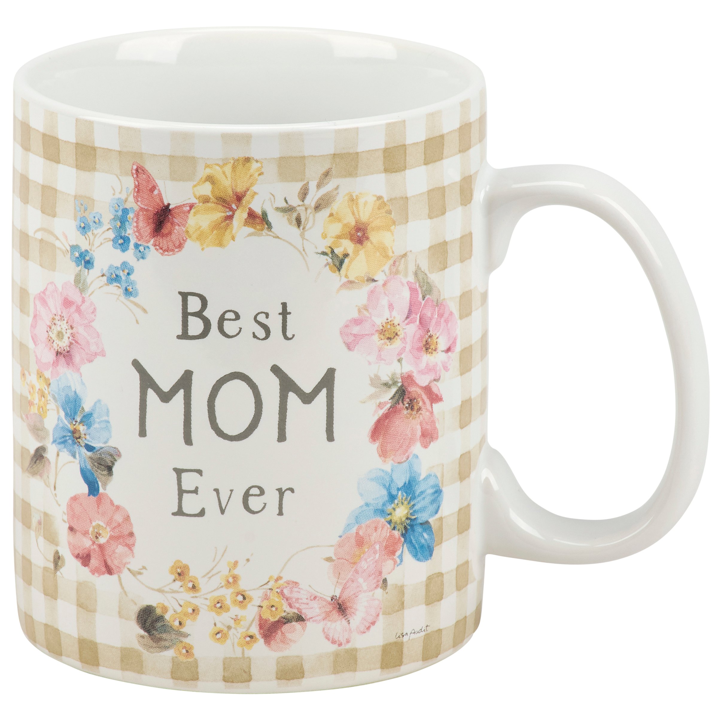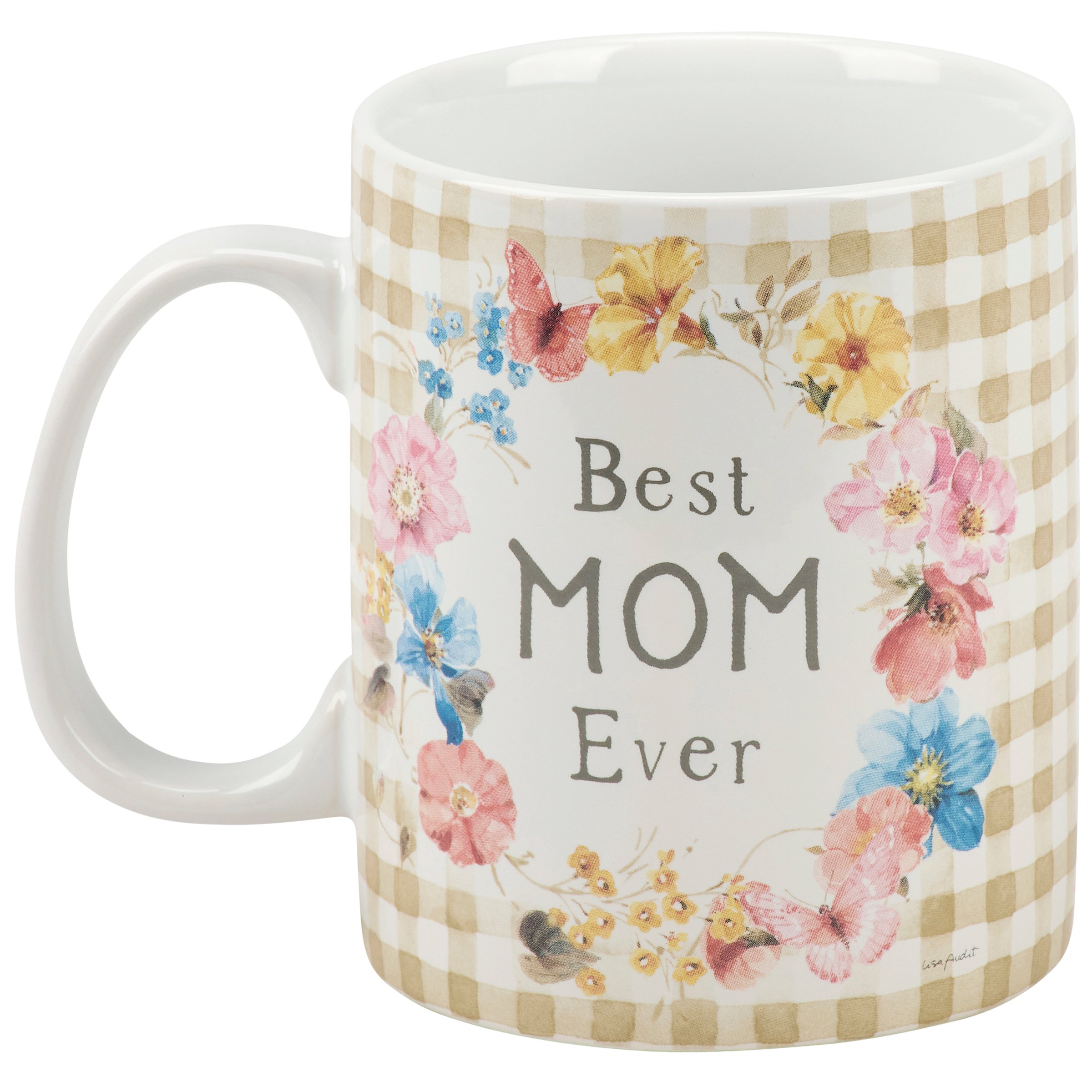 A stoneware 20 oz mug from our Mother's Day Collection featuring a double-sided design displaying colorful flowers and gingham pattern around a fun mom inspired sentiment that reads "Best Mom Ever." Floral designs and pattern replicated from original art hand painted in a delicate watercolor style. Our Best Mom Ever Floral mug is conveniently microwave, oven, dishwasher, and food safe for easy use. A lovely gift for Mother's Day that can be used all year round as everyday drinkware.