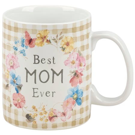 A stoneware 20 oz mug from our Mother's Day Collection featuring a double-sided design displaying colorful flowers and gingham pattern around a fun mom inspired sentiment that reads "Best Mom Ever." Floral designs and pattern replicated from original art hand painted in a delicate watercolor style. Our Best Mom Ever Floral mug is conveniently microwave, oven, dishwasher, and food safe for easy use. A lovely gift for Mother's Day that can be used all year round as everyday drinkware.