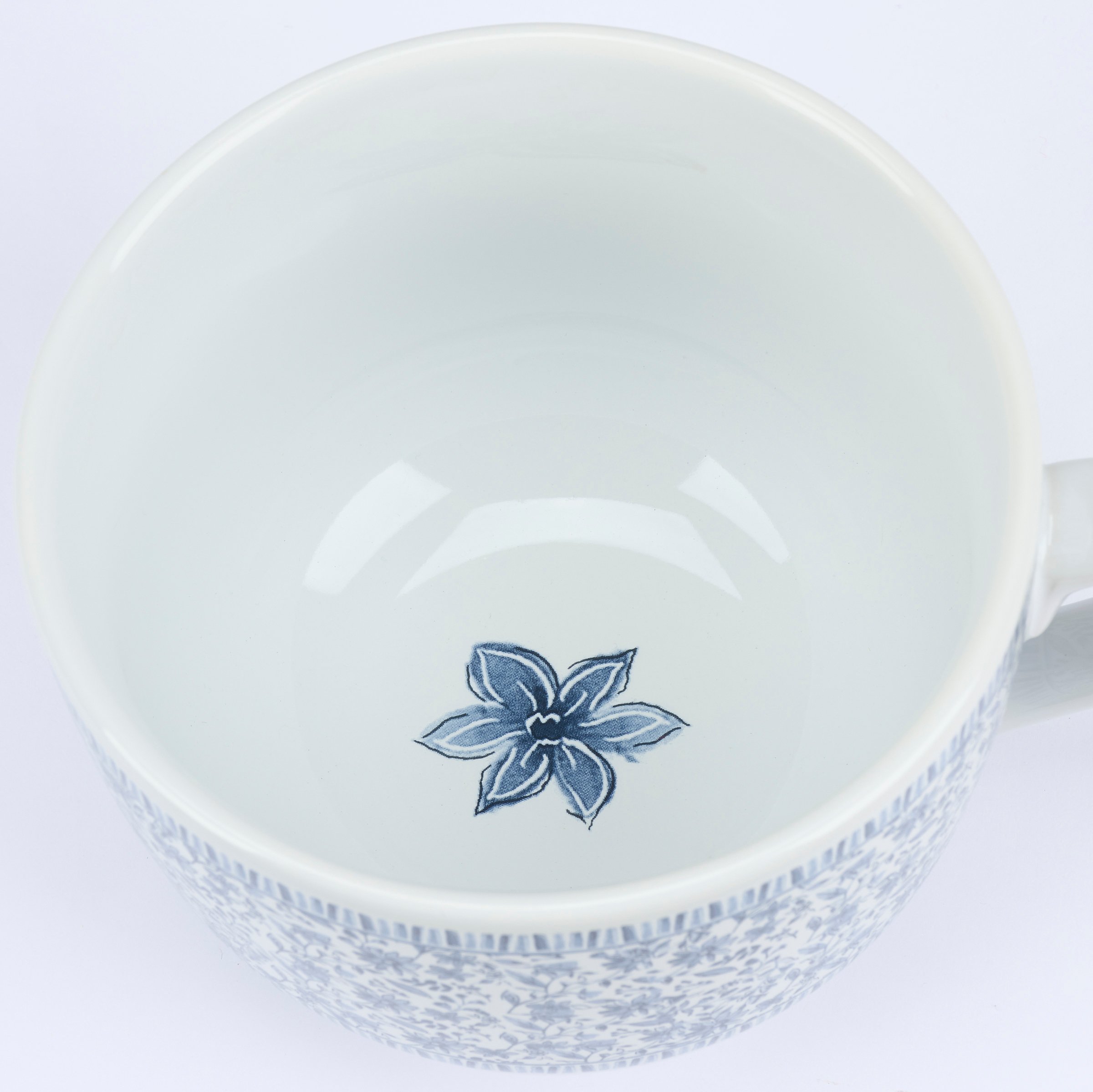 A stoneware 20 oz mug from our Home Collection featuring a full wrap-around design displaying a pattern of florals in a calming indigo color palette replicated from original hand painted watercolor art. This indigo mug also features an inside design with a blue floral at the bottom. Our Blue Florals mug is microwave, oven, dishwasher, and food safe for easy use. A stylish gift perfect for everyday drinkware.