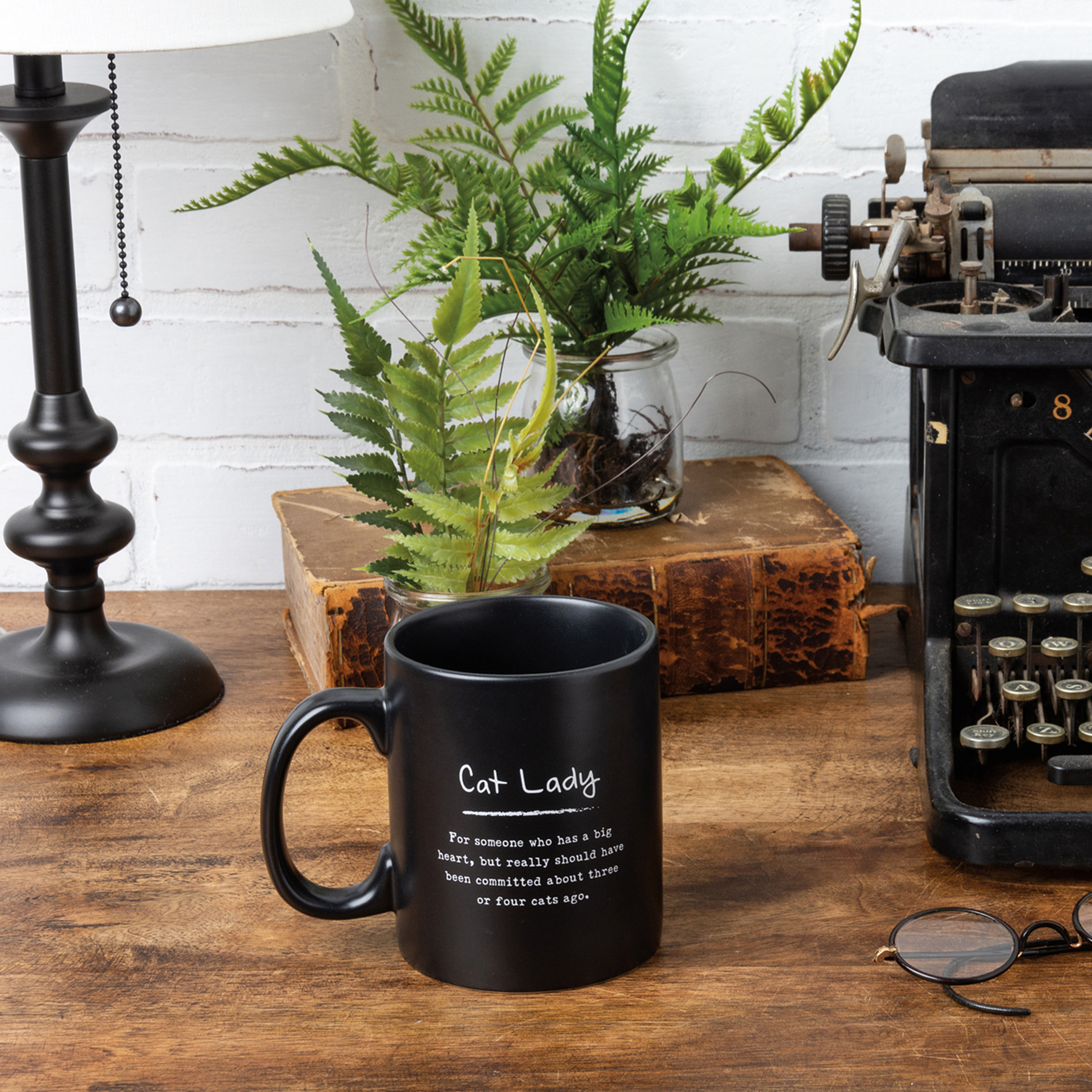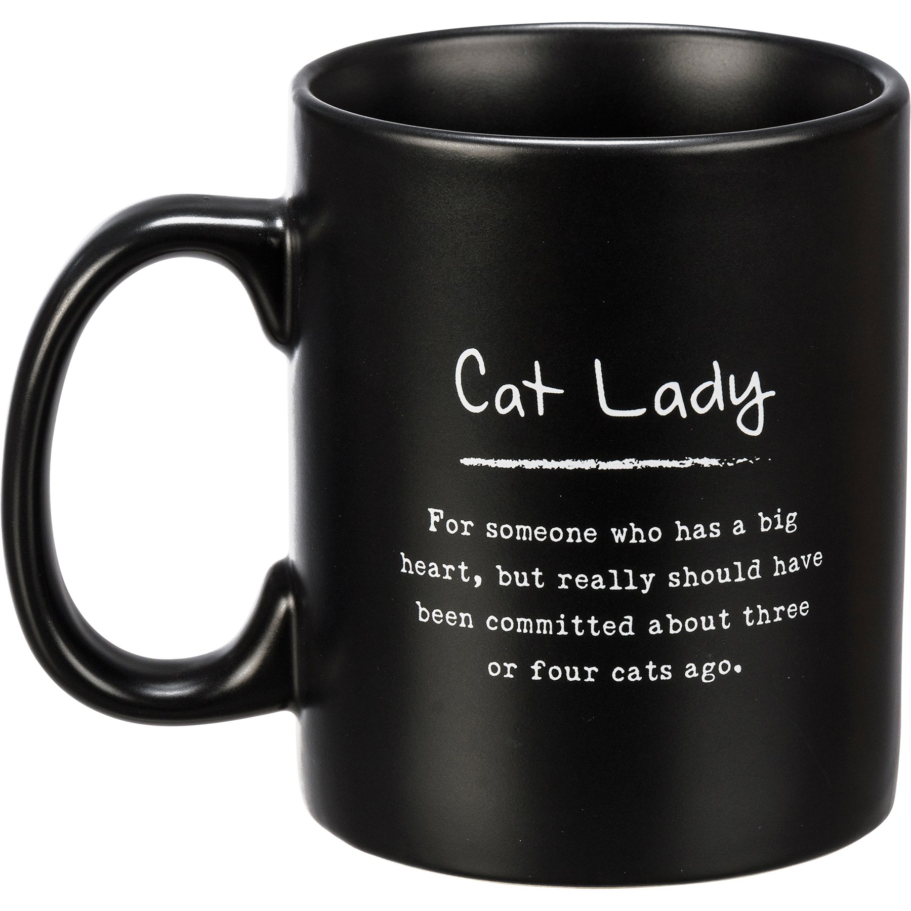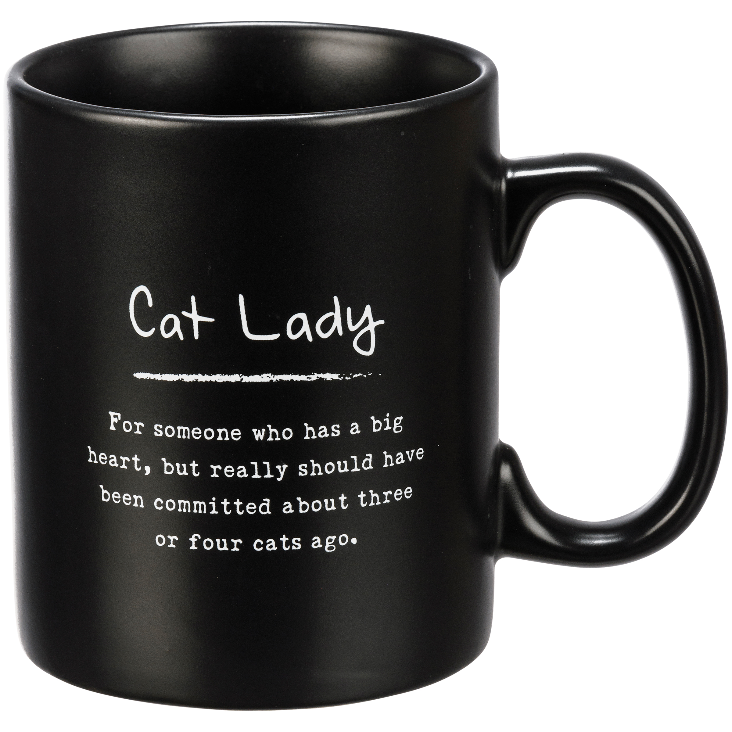 A matte black double-sided stoneware mug from our Poetry Collection features "Cat Lady" sentiment followed by a themed poem. Our Cat Lady mug holds 20 ounces. Microwave, oven, dishwasher, and food safe.