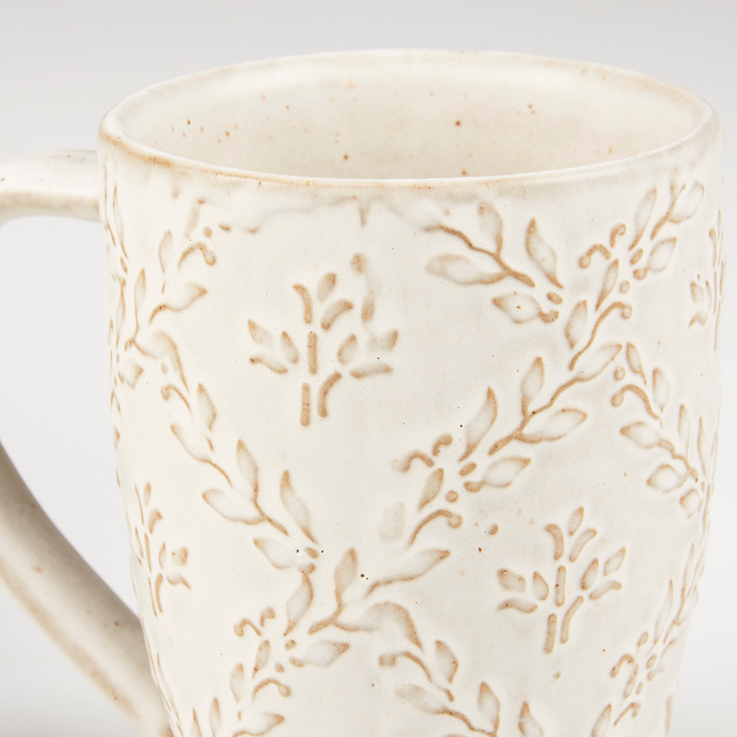 A stoneware 10 oz mug from our Cottagecore Collection displaying a cream glaze finish with embossed patterns of plant vines around the outside. Embossed vine designs come through the glaze for textured detail. Our Cottage Vine mug features a neutral color palette to easily coordinate with a variety of table décor. Hand wash only. A rustic piece of drinkware perfect for everyday gatherings.