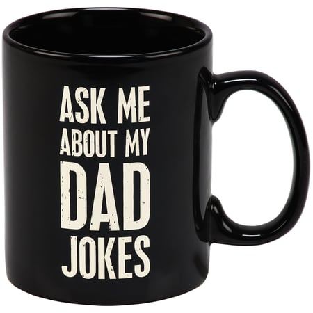 A stoneware 20 oz mug from our Father's Day Collection displaying a double-sided design on black color. Design features humorous dad-themed sentiment in a box sign style that reads "Ask Me About My Dad Jokes." Our Dad Jokes mug is microwave, oven, dishwasher, and food safe. A fun dad-themed gift perfect for everyday drinkware.