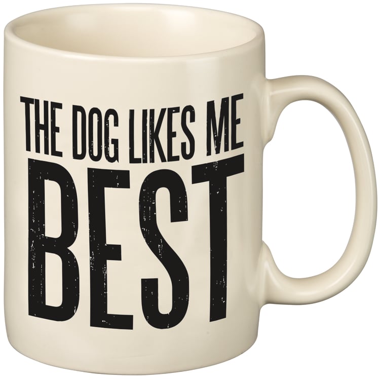 A black and white stoneware coffee mug lending a double-sided and distressed "The Dog Likes Me Best" sentiment. Microwave, oven, dishwasher, and food safe. Holds 20 oz.