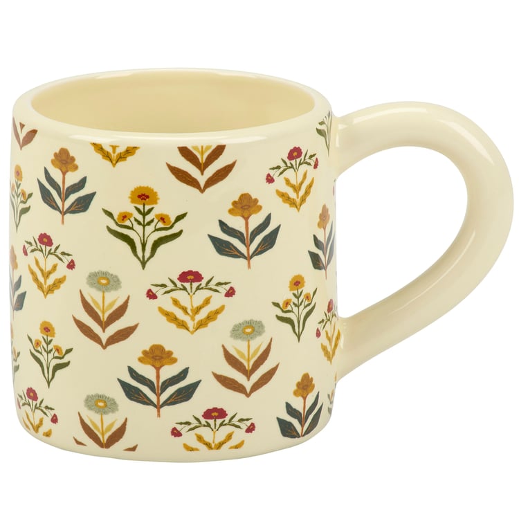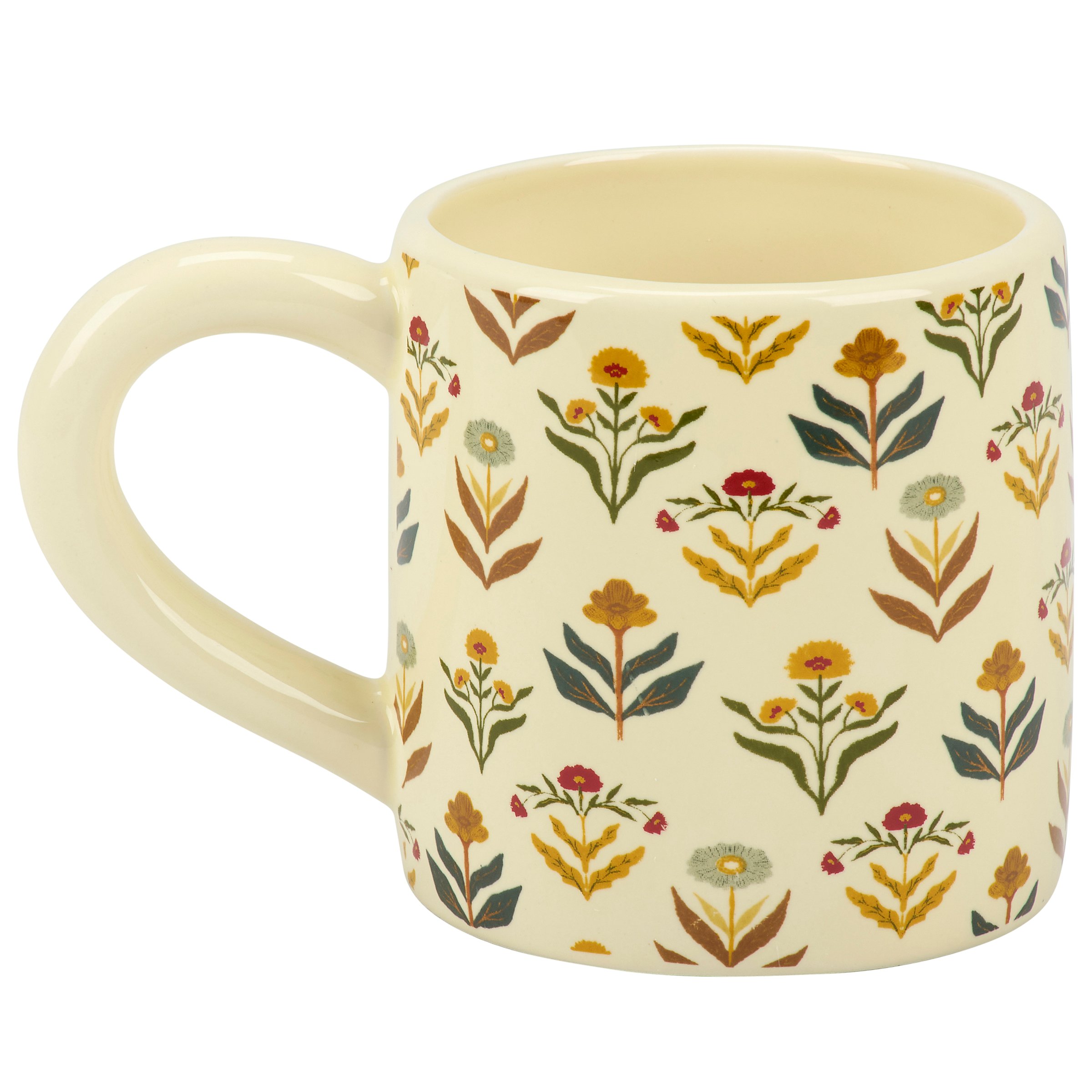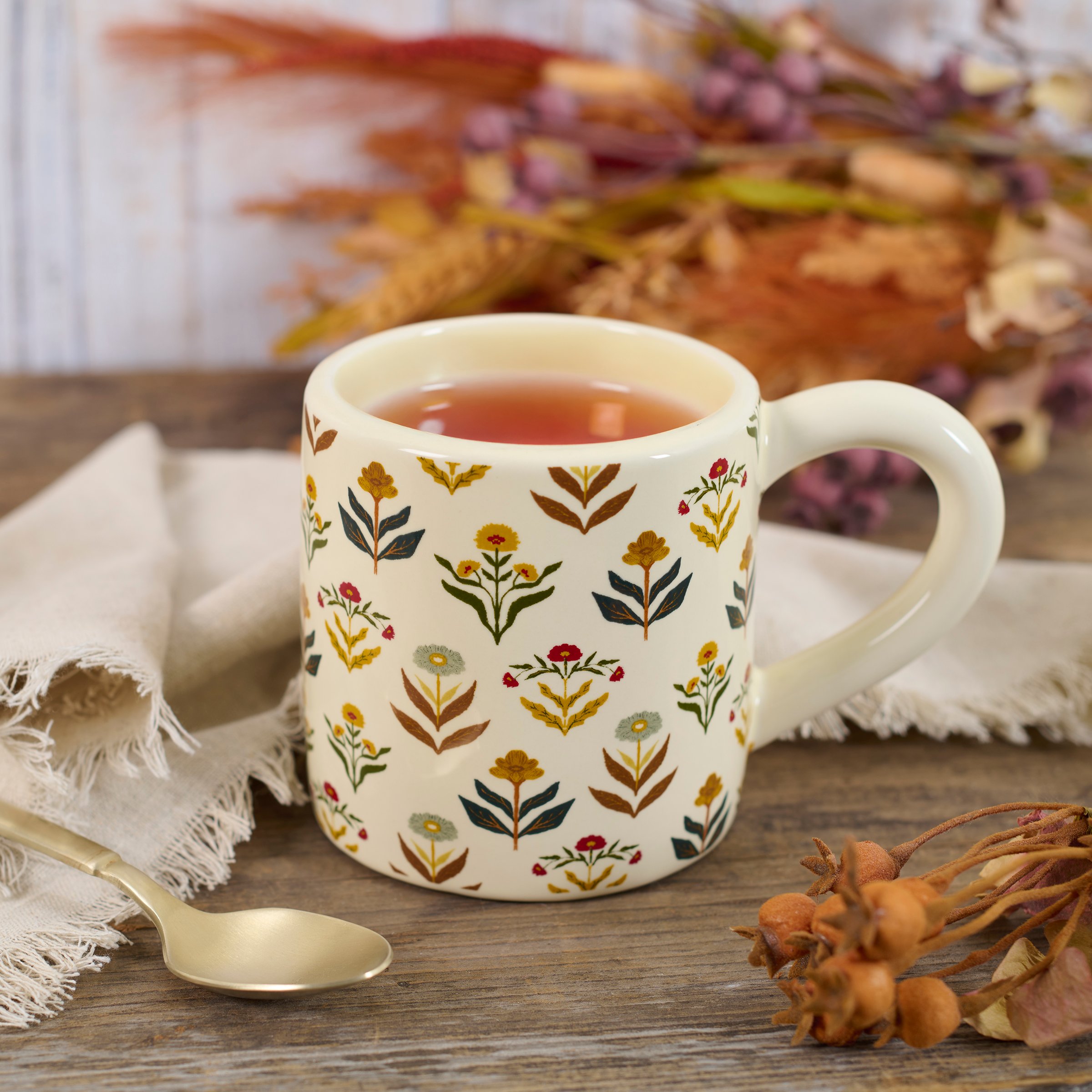 A ceramic 20 oz mug from our Fall & Harvest Collection featuring a full wrap-around design displaying a pattern of folk art inspired fall florals replicated from original hand painted watercolor art. Our Fall Folk Floral mug is microwave, oven, dishwasher, and food safe for easy use. A folk art fall gift perfect for seasonal drinkware.