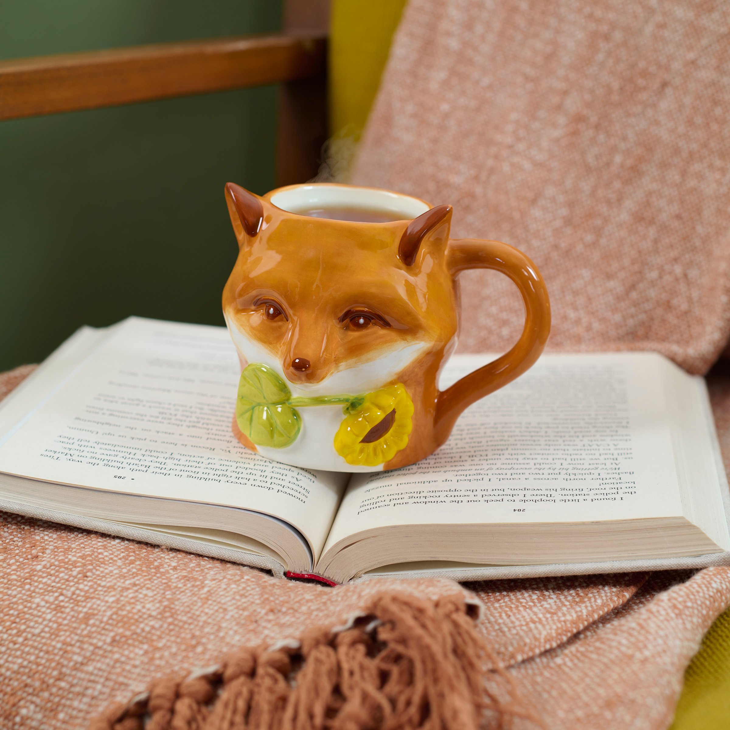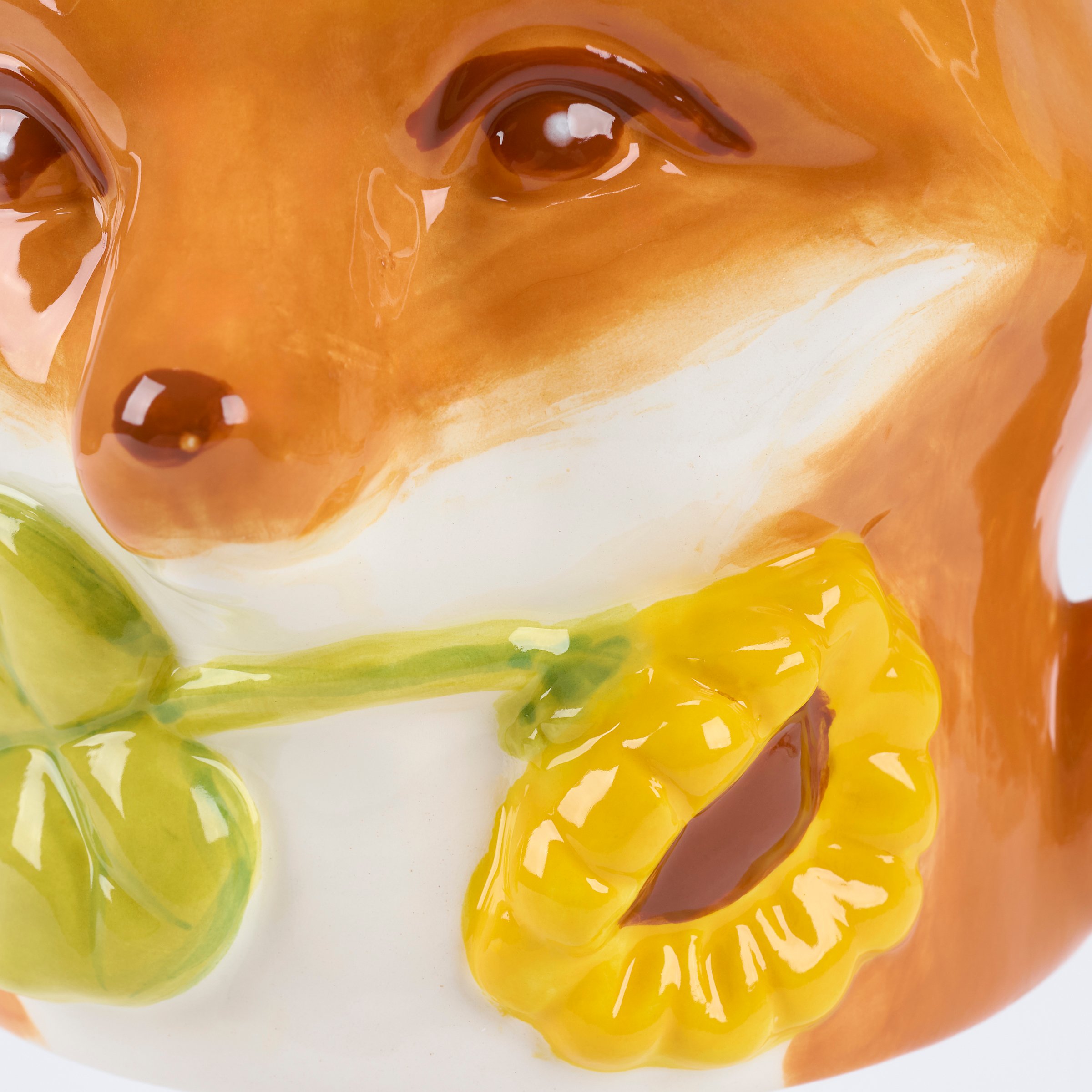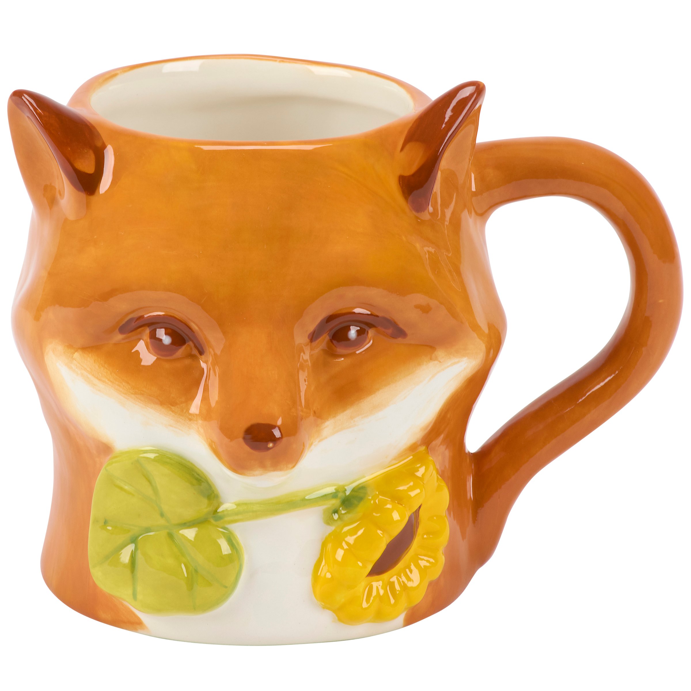 A ceramic 12 oz mug from our Fall & Harvest Collection displaying a sculpted fox design with colorful glaze finish and an opening on top for drinking. Hand wash only. Our Fox mug is a nature themed gift perfect for seasonal drinkware.
