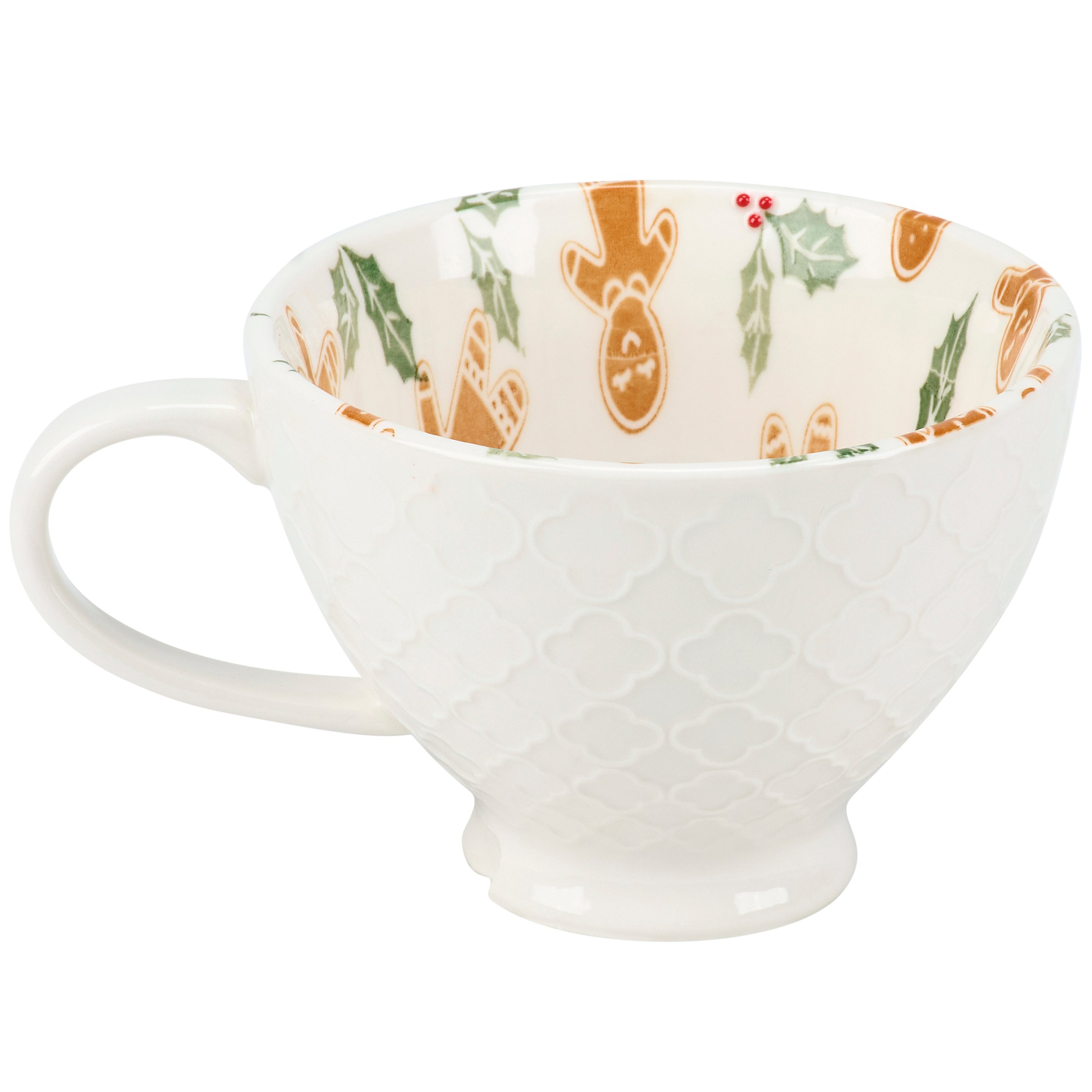 A durable ceramic 12 oz mug from our Christmas Collection featuring a textured pattern on the outside with a gingerbread man and holly pattern on the inside of the mug. Our Gingerbread mug is conveniently microwave, oven, dishwasher, and food safe for easy use. A piece of seasonal drinkware perfect for gingerbread themed tablescapes.