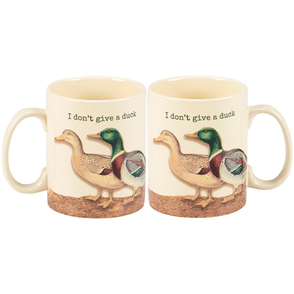 A stoneware 20 oz mug from our Farmhouse Collection displaying a double-sided design of ducks in a vintage style. Design also features a fun farm animal-themed pun that reads "I Don't Give A Duck." Our Give A Duck mug is microwave, oven, dishwasher, and food safe for convenient use. A fun farm-themed gift perfect for everyday drinkware.