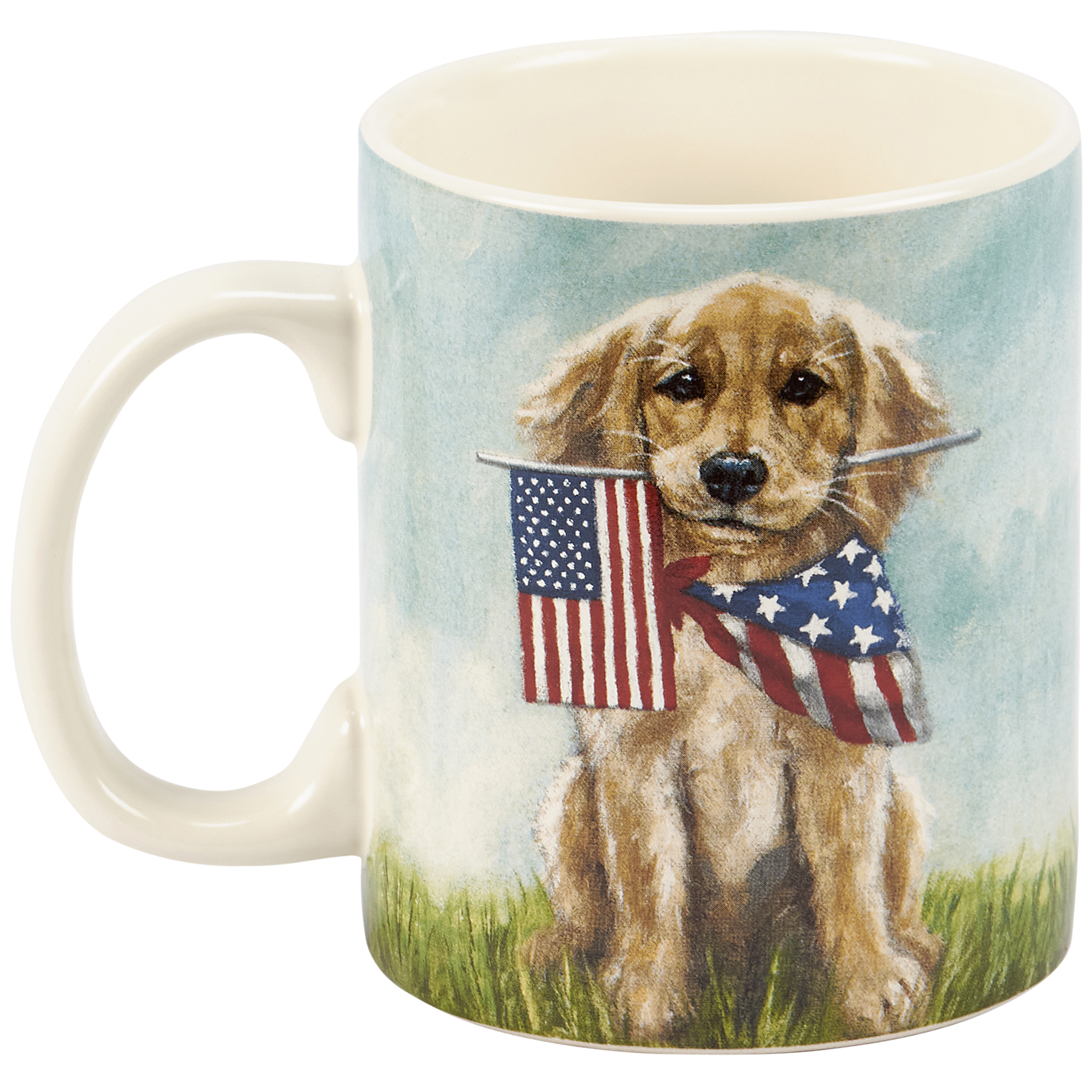 A stoneware 20 oz mug from our Patriotic Collection displaying a double-sided design of a golden retriever puppy wearing a stars and stripes bandana and holding an American flag in its mouth. Patriotic puppy design is replicated from original artwork painted onto burlap canvas, giving the art a unique depth and texture. Our Golden Puppy mug is conveniently microwave, oven, dishwasher, and food safe for easy use. A patriotic mug perfect for everyday drinkware.