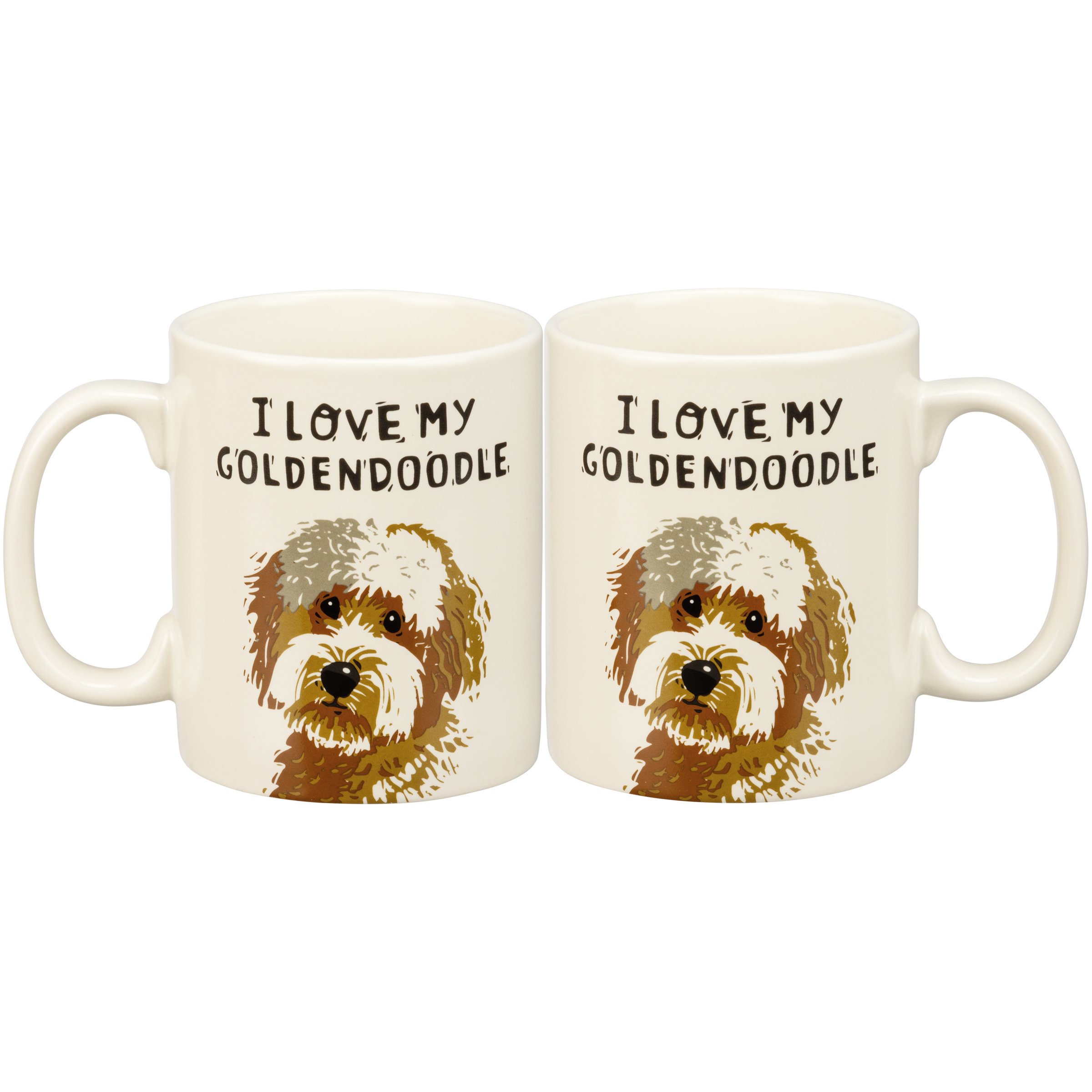 A double-sided stoneware mug from our Pet Collection features an "I Love My Golden doodle" sentiment and block print golden doodle design. The I Love My Golden doodle mug holds 20 oz. Microwave, oven, dishwasher and food safe.