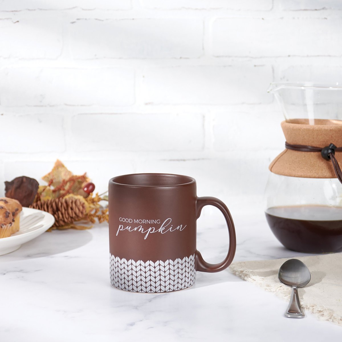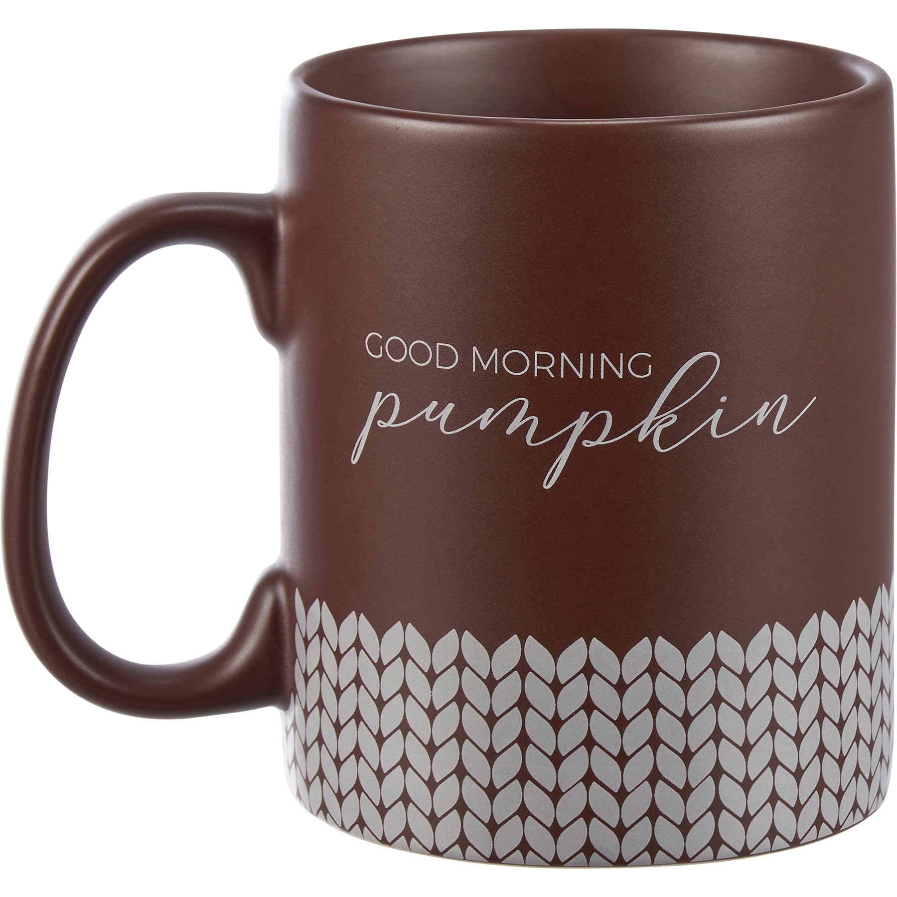 A brown stoneware 20 oz mug from our Fall & Harvest Collection displaying a full wrap-around sweater pattern along the bottom with "Good Morning Pumpkin" sentiment on both sides. Our Good Morning Pumpkin mug is microwave, oven, dishwasher, and food safe. A fun mug perfect for seasonal drinkware.
