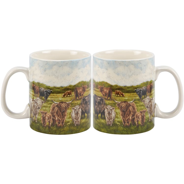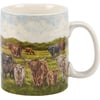 A stoneware 20 oz mug from our Farmhouse Collection displaying a full wrap-around design of a various highland cows in a field. Highland cows design is replicated from original artwork painted onto burlap canvas, giving the art a unique depth and texture. Our Highland Cows mug is conveniently microwave, oven, dishwasher, and food safe for easy use. A rustic farm-themed gift perfect for everyday drinkware.