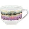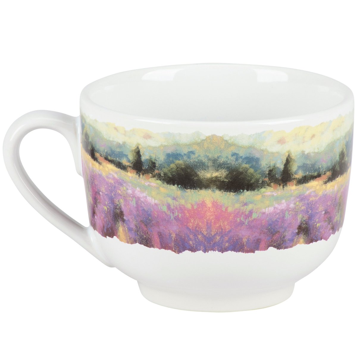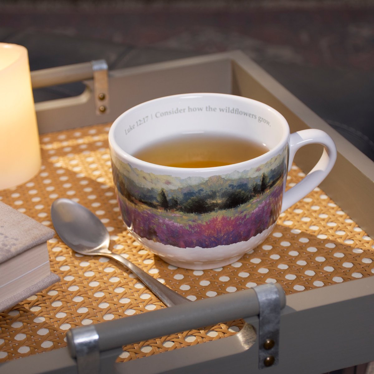 A stoneware 20 oz mug from our Faith Collection displaying a full wrap-around design of a calming landscape replicated from gorgeous original oil pastel artwork. Faith mug also features an inside design with inspirational scripture along the rim that reads "Luke 12:17 | Consider How The Wildflowers Grow" and a cross design at the bottom. Our How The Wildflowers Grow mug is microwave, oven, dishwasher, and food safe for easy use. A faith-themed gift perfect for everyday inspirational drinkware.