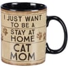 A stoneware 20 oz mug displaying a double-sided design of a fun cat-themed sentiment on a rustic slat wood background that reads "I Just Want To Be A Stay At Home Cat Mom." Our Stay At Home Cat Mom mug is microwave, oven, dishwasher, and food safe for convenient use. A fun pet-themed gift perfect for everyday drinkware.
