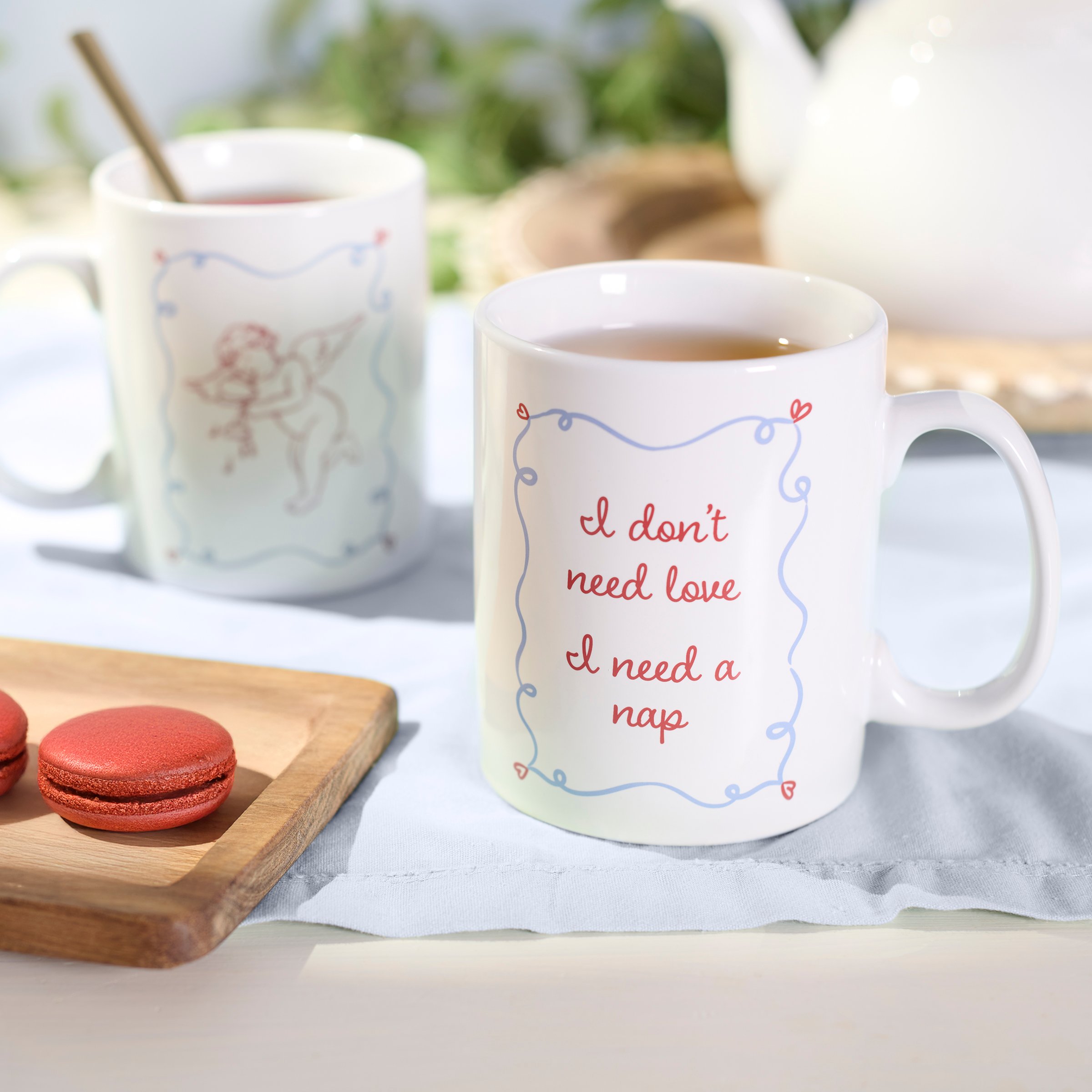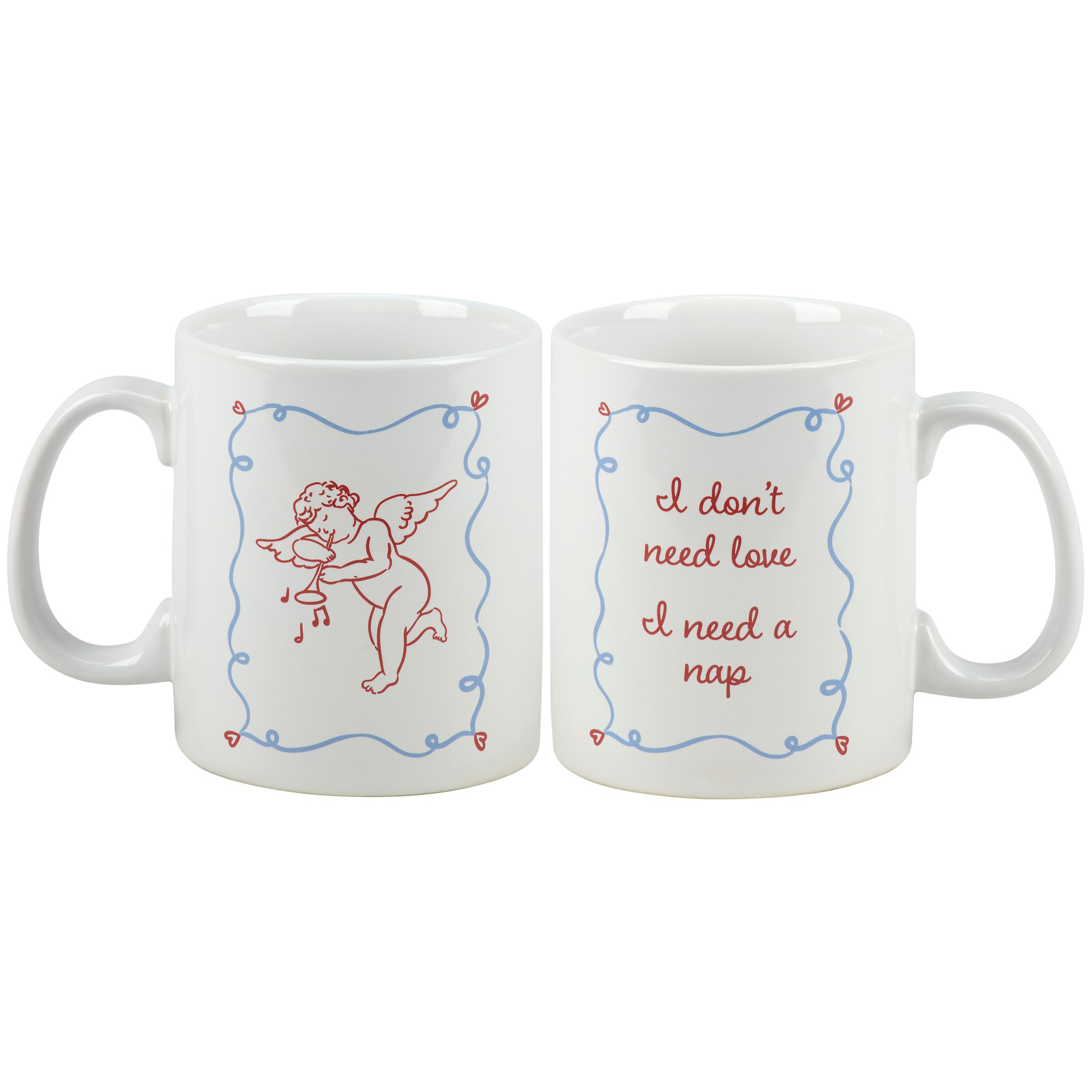 A stoneware 20 oz mug from our Anti Valentine Collection featuring a double-sided design displaying cupid art in a hand illustrated style on one side and a sarcastic love-themed sentiment on the other side that reads "I Don't Need Love - I Need A Nap." Our I Need A Nap mug is conveniently microwave, oven, dishwasher, and food safe for easy use. A sassy love-themed gift that offers a fun alternative for Valentine's Day style.