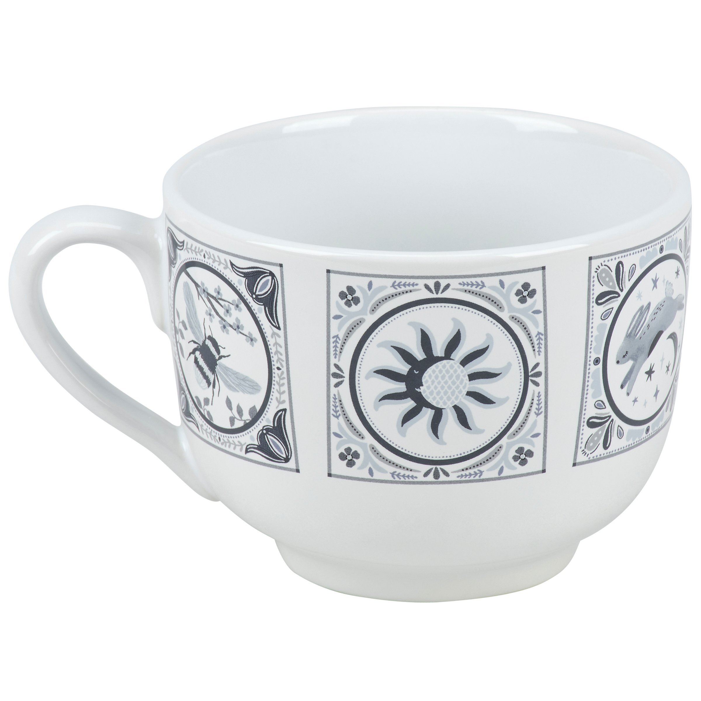 A stoneware 20 oz mug from our Home Collection featuring a full wrap-around design displaying a pattern of tile inspired illustrations in a calming indigo color palette with various nature scenes in the centers. This indigo mug also features an inside design with inspirational sentiment along the rim that reads "Be Gentle With Yourself" and butterfly at the bottom. Our Indigo Tile mug is microwave, oven, dishwasher, and food safe for easy use. An inspirational gift perfect for adding daily motivation to everyday drinkware.