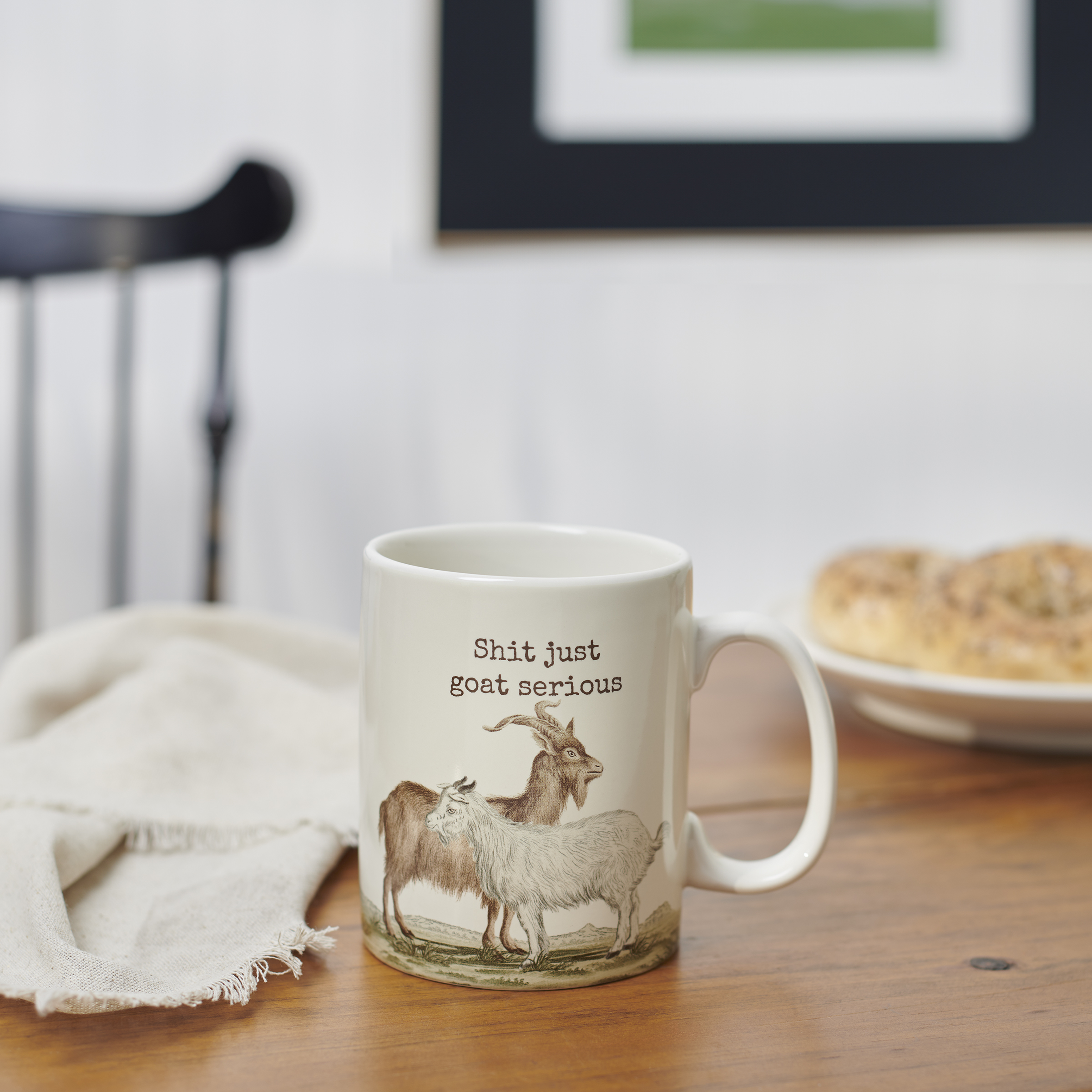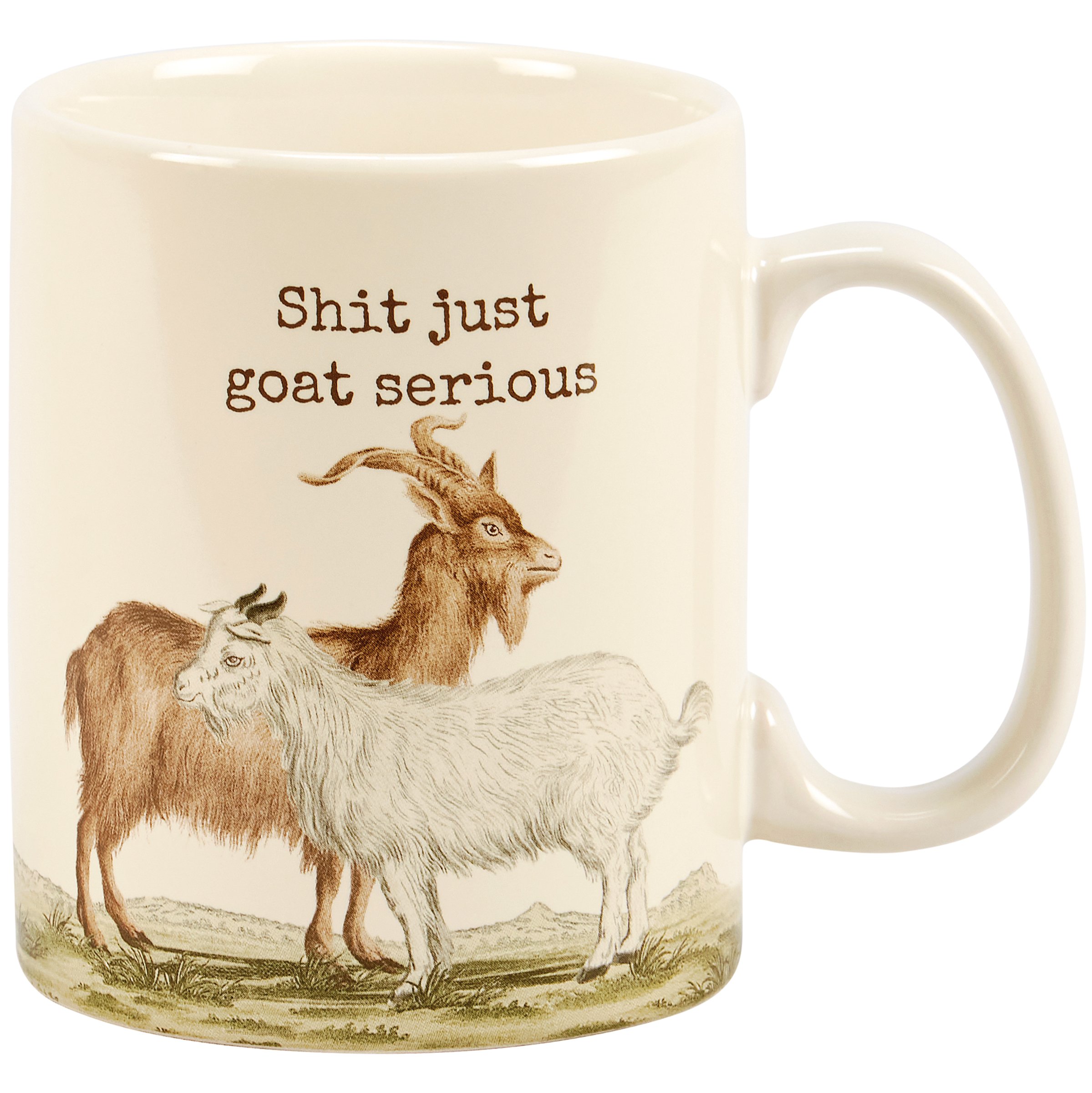 A stoneware 20 oz mug from our Farmhouse Collection displaying a double-sided design of goats in a vintage art style with and a fun goat pun that reads "Shit Just Goat Serious." Our Just Goat Serious mug is conveniently microwave, oven, dishwasher, and food safe for easy use. A fun farm-themed gift perfect for everyday drinkware.