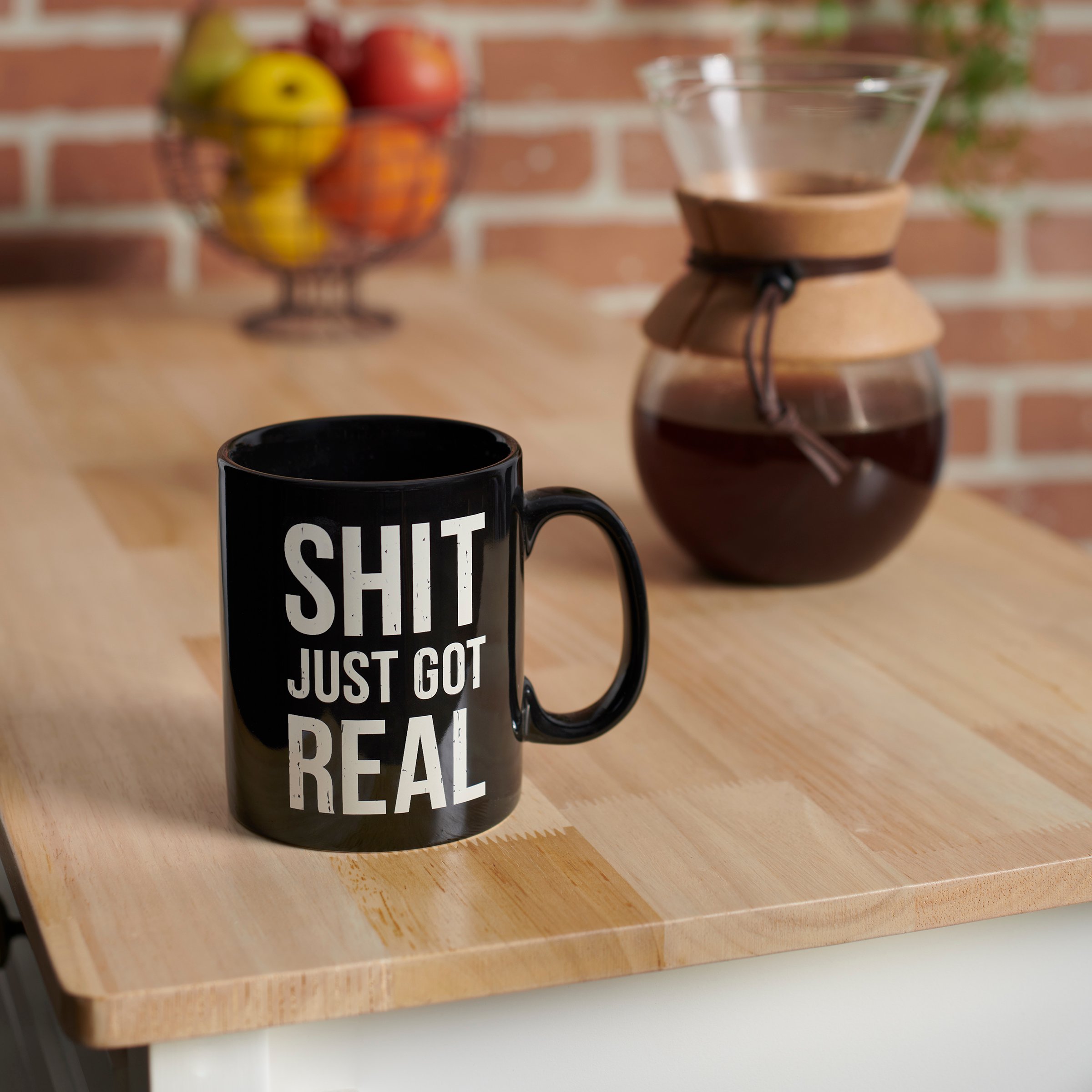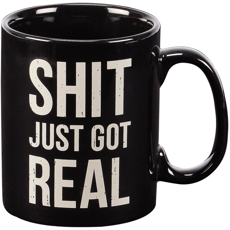 A stoneware 20 oz mug from our Box Sign Style Collection displaying a double-sided design of a sassy sentiment in a classic box sign style that reads "Shit Just Got Real." Our Just Got Real mug is conveniently microwave, oven, dishwasher, and food safe for easy use. A funny gift perfect for everyday drinkware.