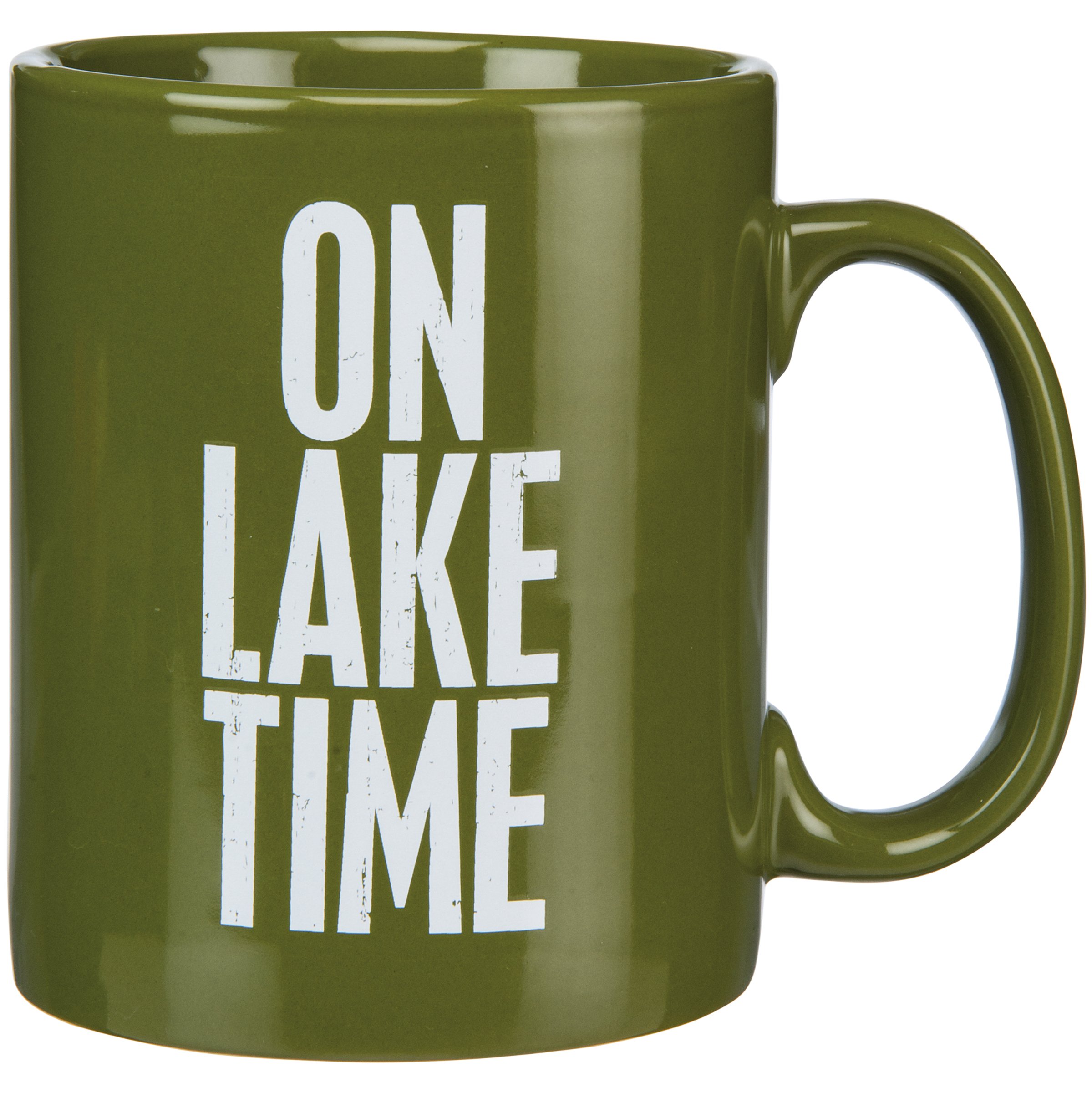 A stoneware coffee mug from our Lake & Cabin Collection lends a distressed "On Lake Time" sentiment. Microwave, oven, dishwasher, and food safe. The On Lake Time mug holds 20 oz.