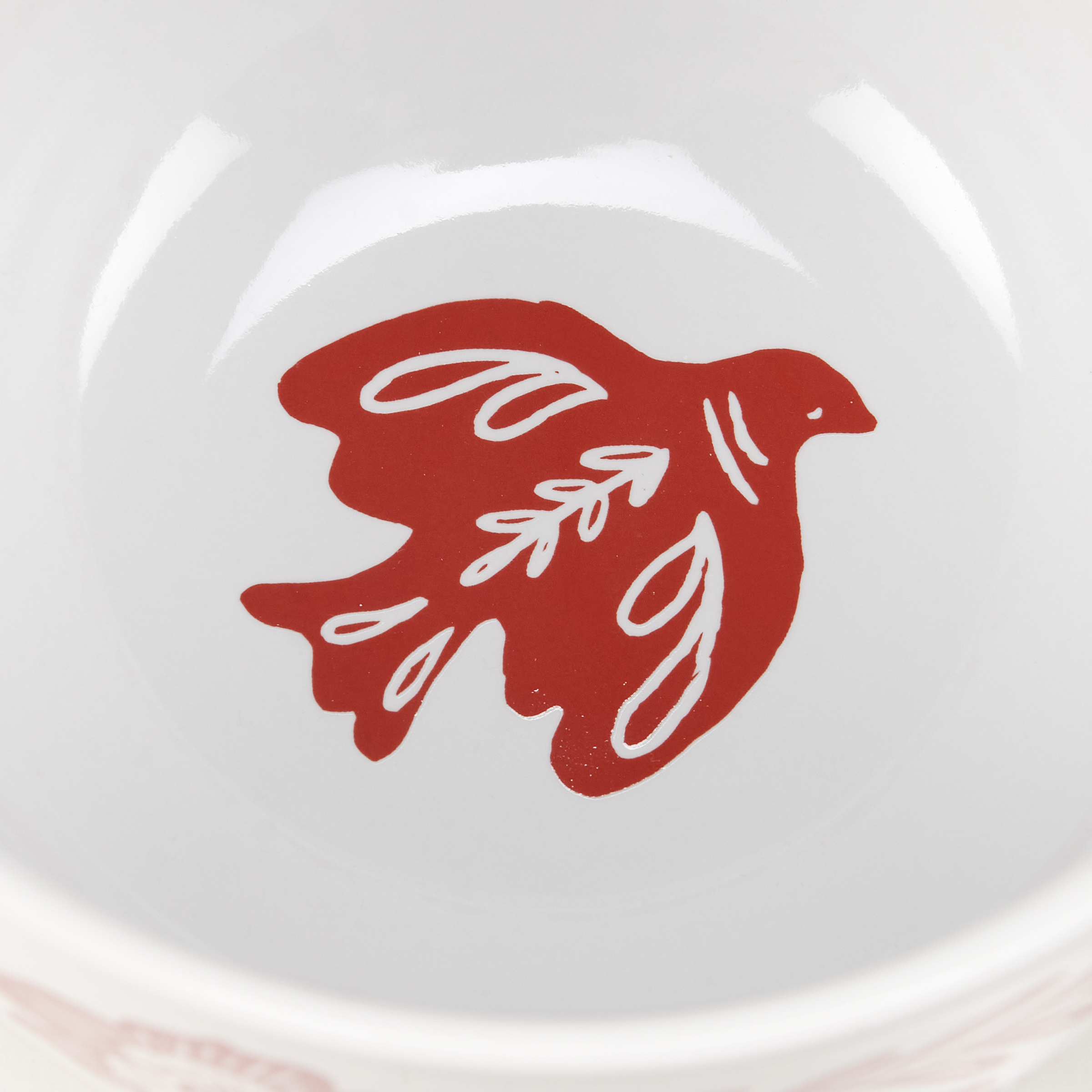 A stoneware 20 oz mug from our Folk Art Collection displaying a full wrap-around design of hand illustrated red florals inspired by Scandinavian folk art. Mug also features an inside design with inspirational sentiment along the rim that reads "Love For Today - Serenity For Tomorrow" and a red peace dove at the bottom. Our Love For Today mug is conveniently microwave, oven, dishwasher, and food safe for easy use. An inspirational mug perfect for everyday drinkware.