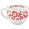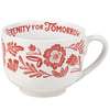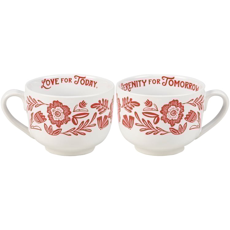 A stoneware 20 oz mug from our Folk Art Collection displaying a full wrap-around design of hand illustrated red florals inspired by Scandinavian folk art. Mug also features an inside design with inspirational sentiment along the rim that reads "Love For Today - Serenity For Tomorrow" and a red peace dove at the bottom. Our Love For Today mug is conveniently microwave, oven, dishwasher, and food safe for easy use. An inspirational mug perfect for everyday drinkware.