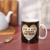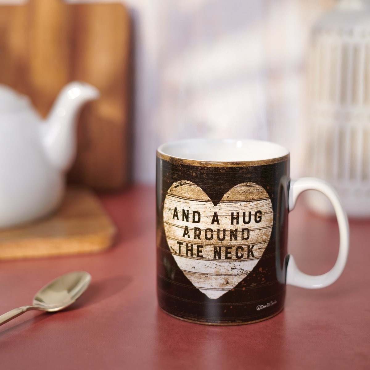 A stoneware coffee mug lending a double-sided, distressed "Love You A Bushel And A Peck And A Hug Around The Neck" sentiment with slatted wooden background print and heart design. Microwave, oven, dishwasher, and food safe. Holds 20 oz.