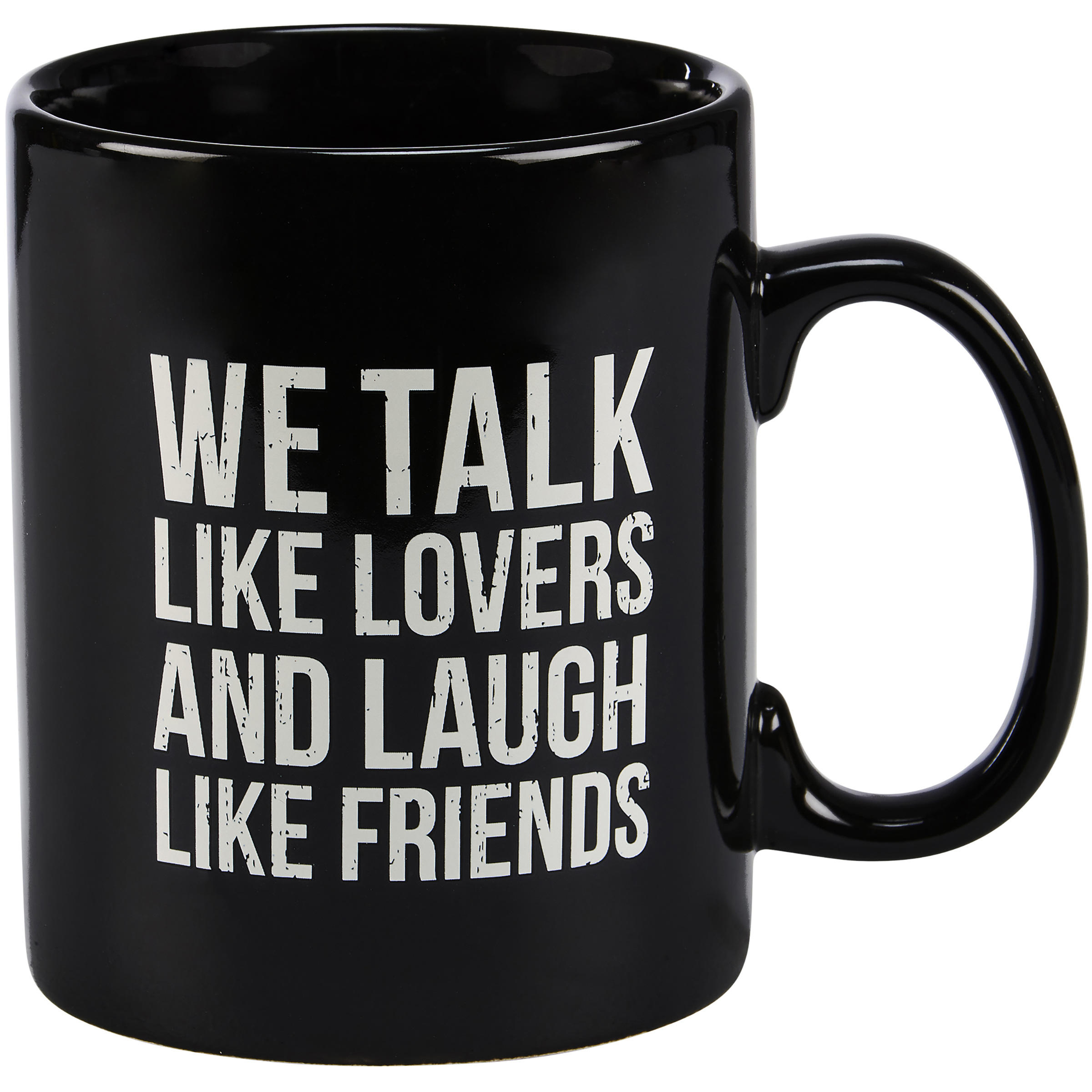 A stoneware 20 oz mug from our Box Sign Style Collection displaying a double-sided design on black color. Design features heartwarming sentiment in a box sign style that reads "We Talk Like Lovers And Laugh Like Friends." Our Lovers And Friends mug is microwave, oven, dishwasher, and food safe. A lovely gift perfect for everyday drinkware.