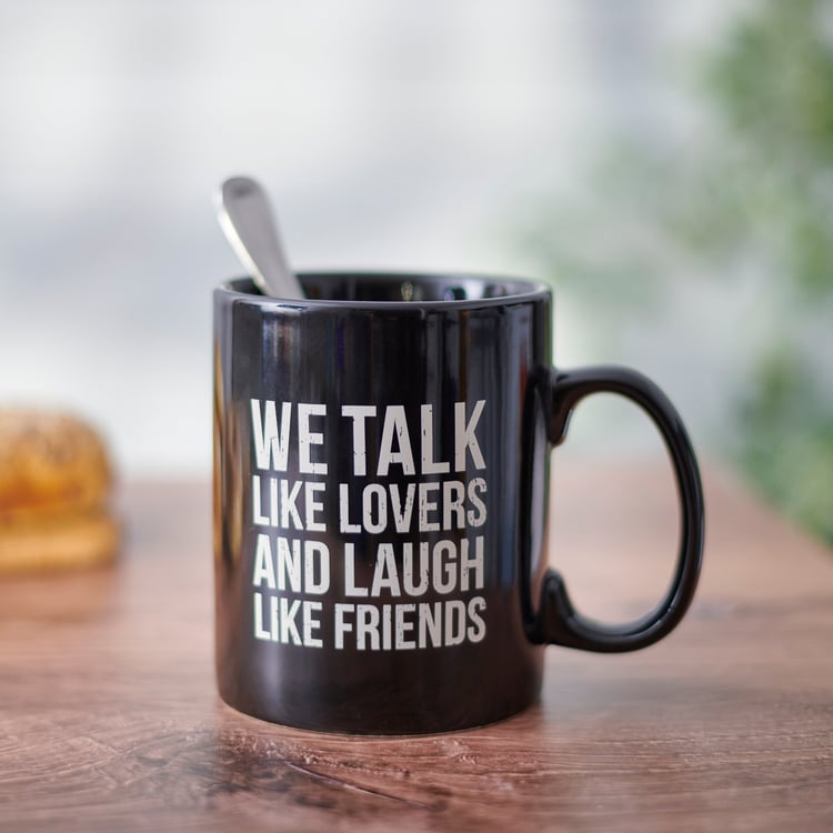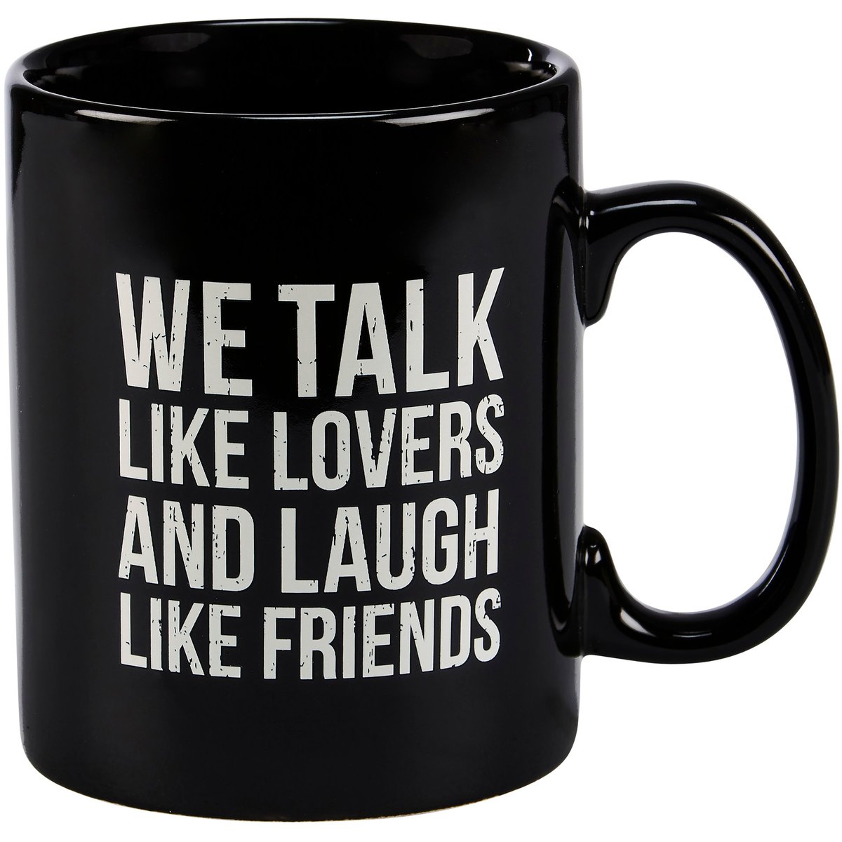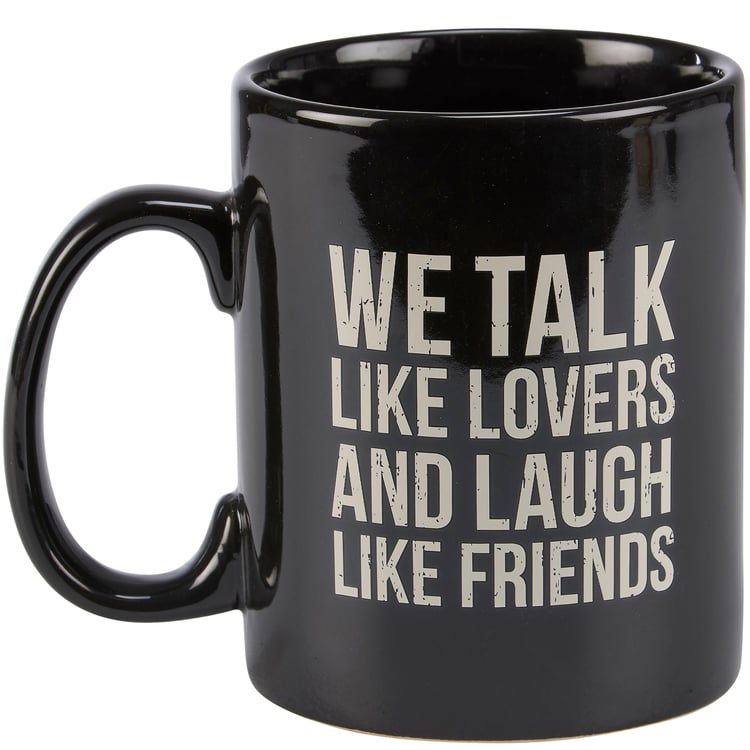 A stoneware 20 oz mug from our Box Sign Style Collection displaying a double-sided design on black color. Design features heartwarming sentiment in a box sign style that reads "We Talk Like Lovers And Laugh Like Friends." Our Lovers And Friends mug is microwave, oven, dishwasher, and food safe. A lovely gift perfect for everyday drinkware.