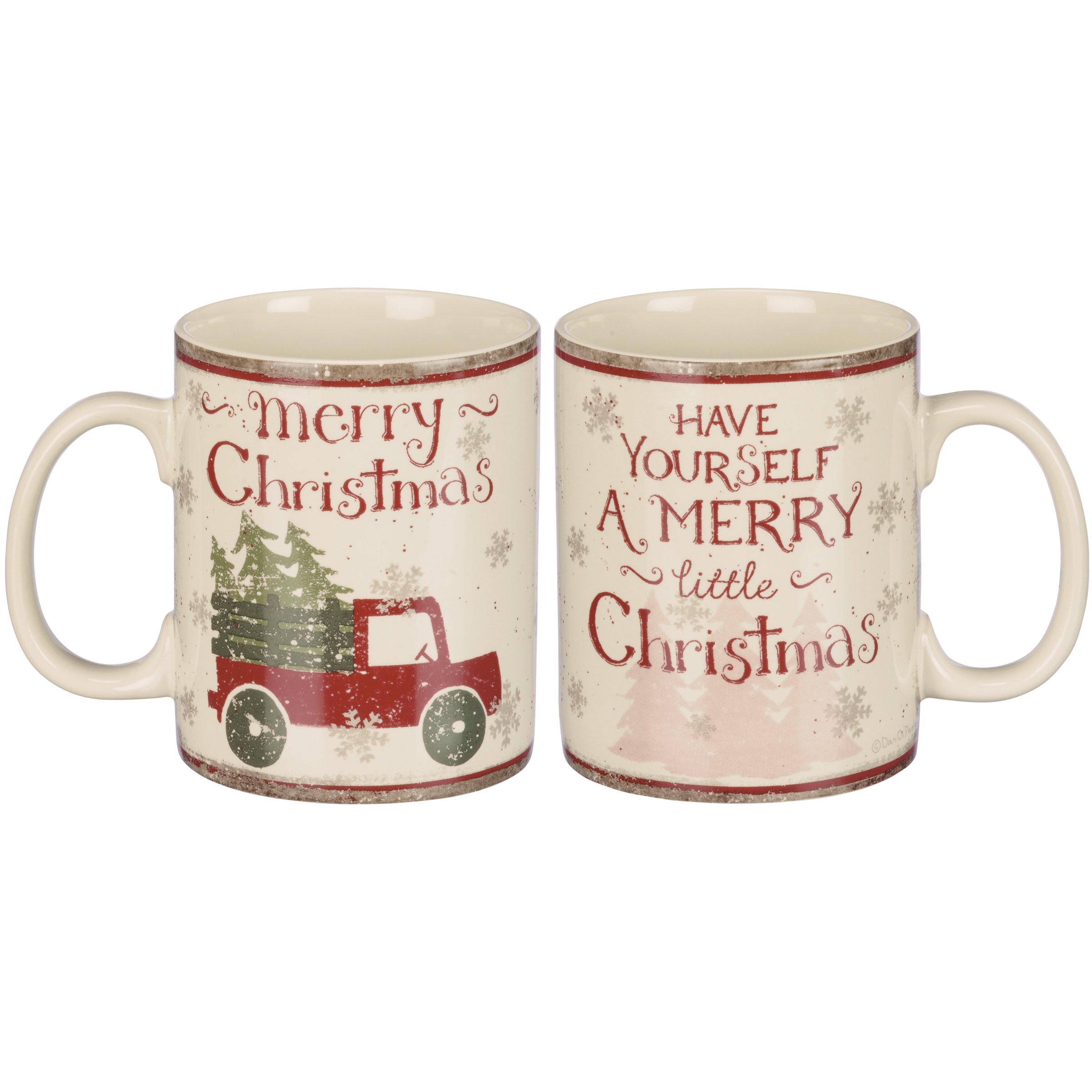 A rustic-inspired stoneware mug for Christmas lending double-sided distressed "Merry Christmas / Have Yourself A Merry Little Christmas" sentiment with snowy truck and trees design. Complements well with coordinating design pieces for a festive collection. Microwave, oven, dishwasher, and food safe; holds 20 oz.