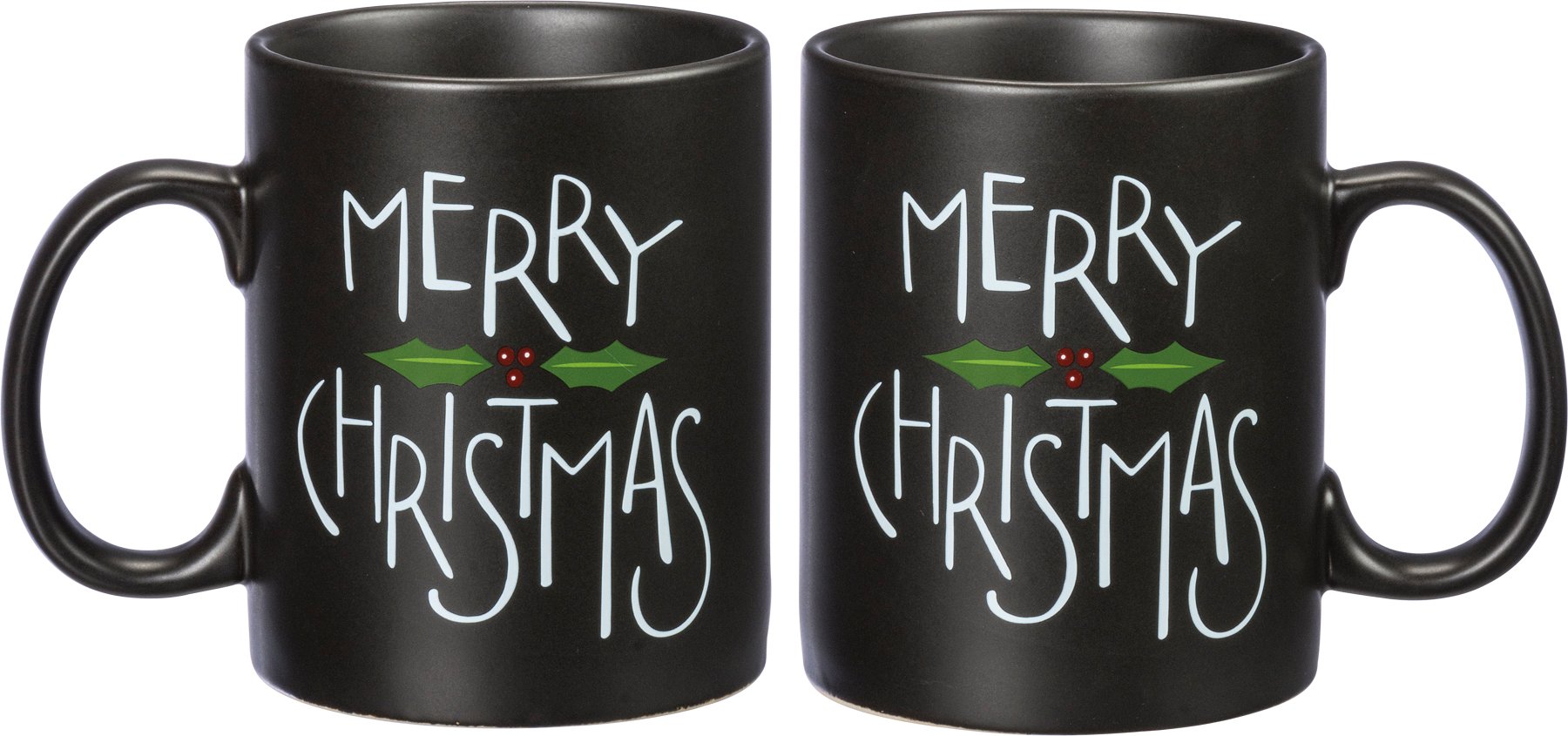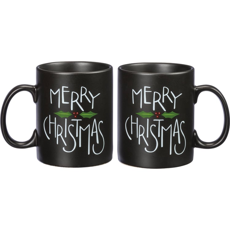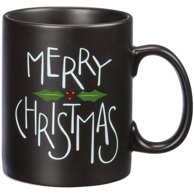 A black and white stoneware coffee mug from our Drinkware & Accessories features a hand lettered "Merry Christmas" sentiment with holly designs. Microwave, oven, food, and dishwasher safe. The Merry Christmas mug holds 20 oz.
