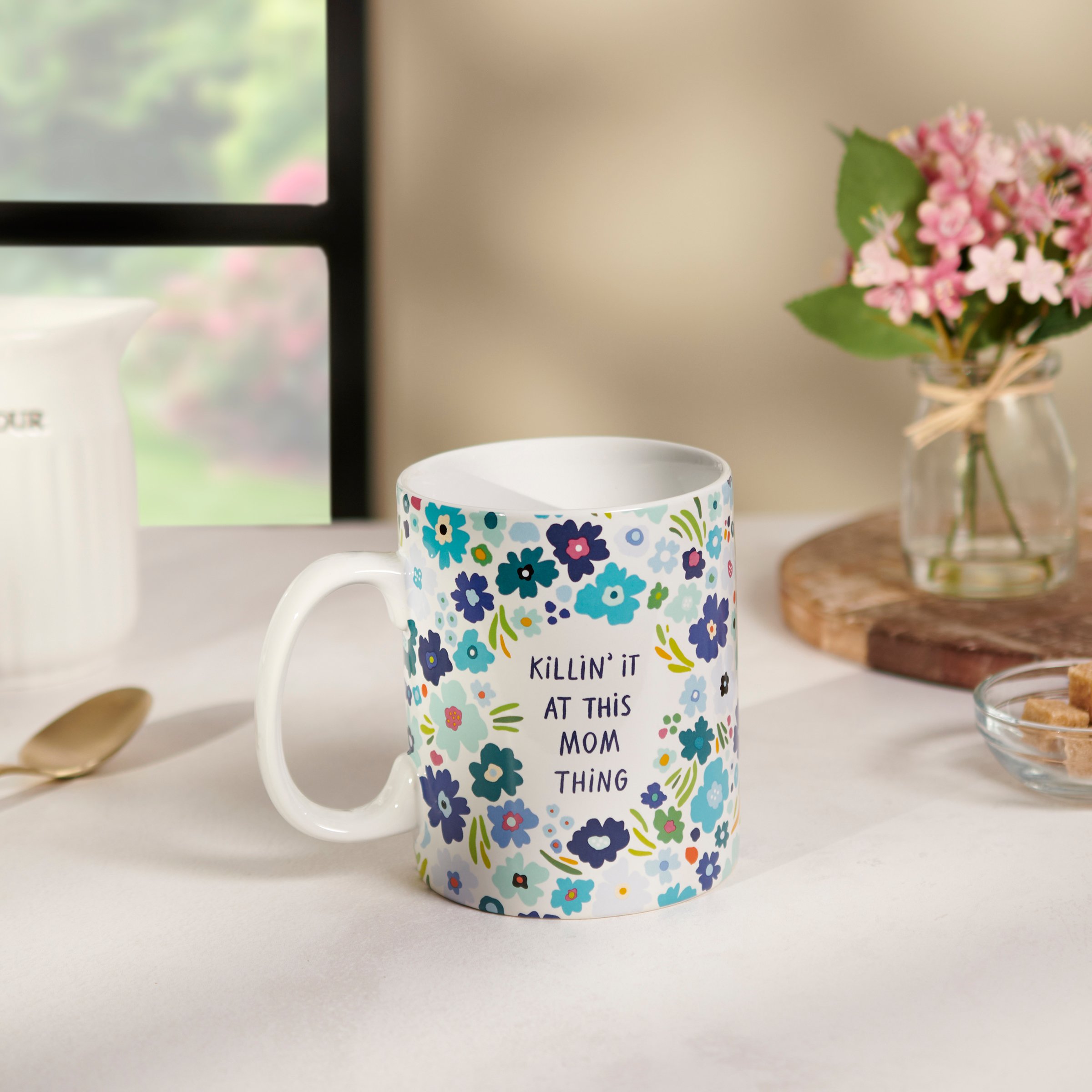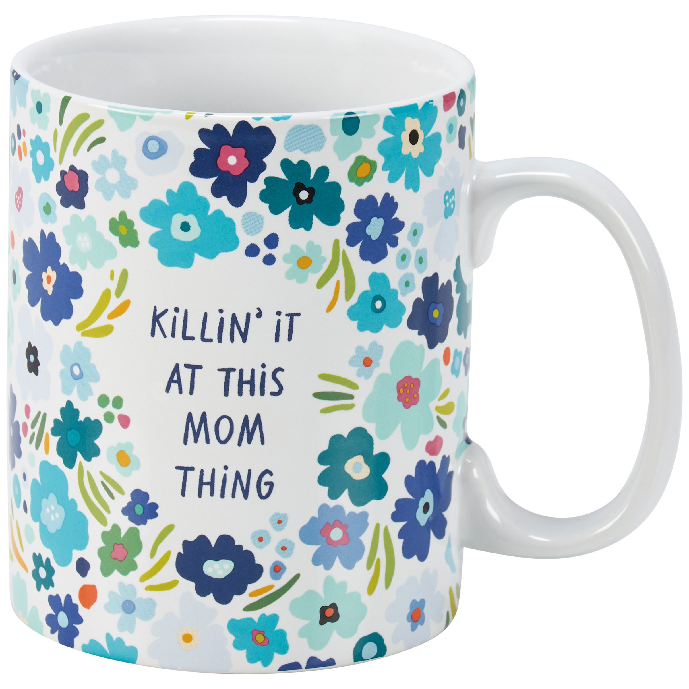 A stoneware 20 oz mug from our Mother's Day Collection displaying a double-sided design of vibrant hand illustrated flowers in a blue color palette surrounding a fun mom-themed sentiment that reads "Killin' It At This Mom Thing." Our Mom Thing mug is microwave, oven, dishwasher, and food safe. A fun gift perfect for Mother's Day or everyday drinkware.