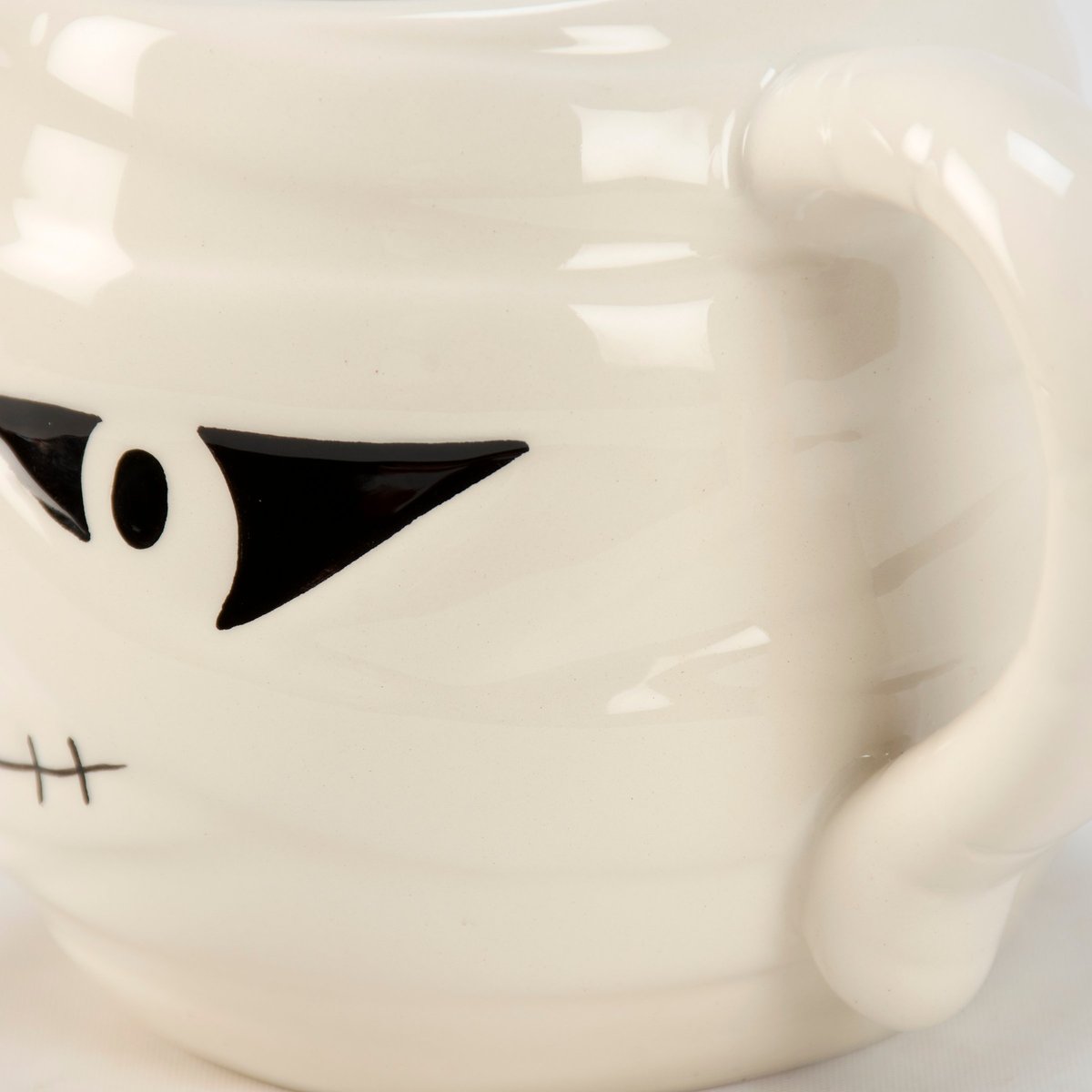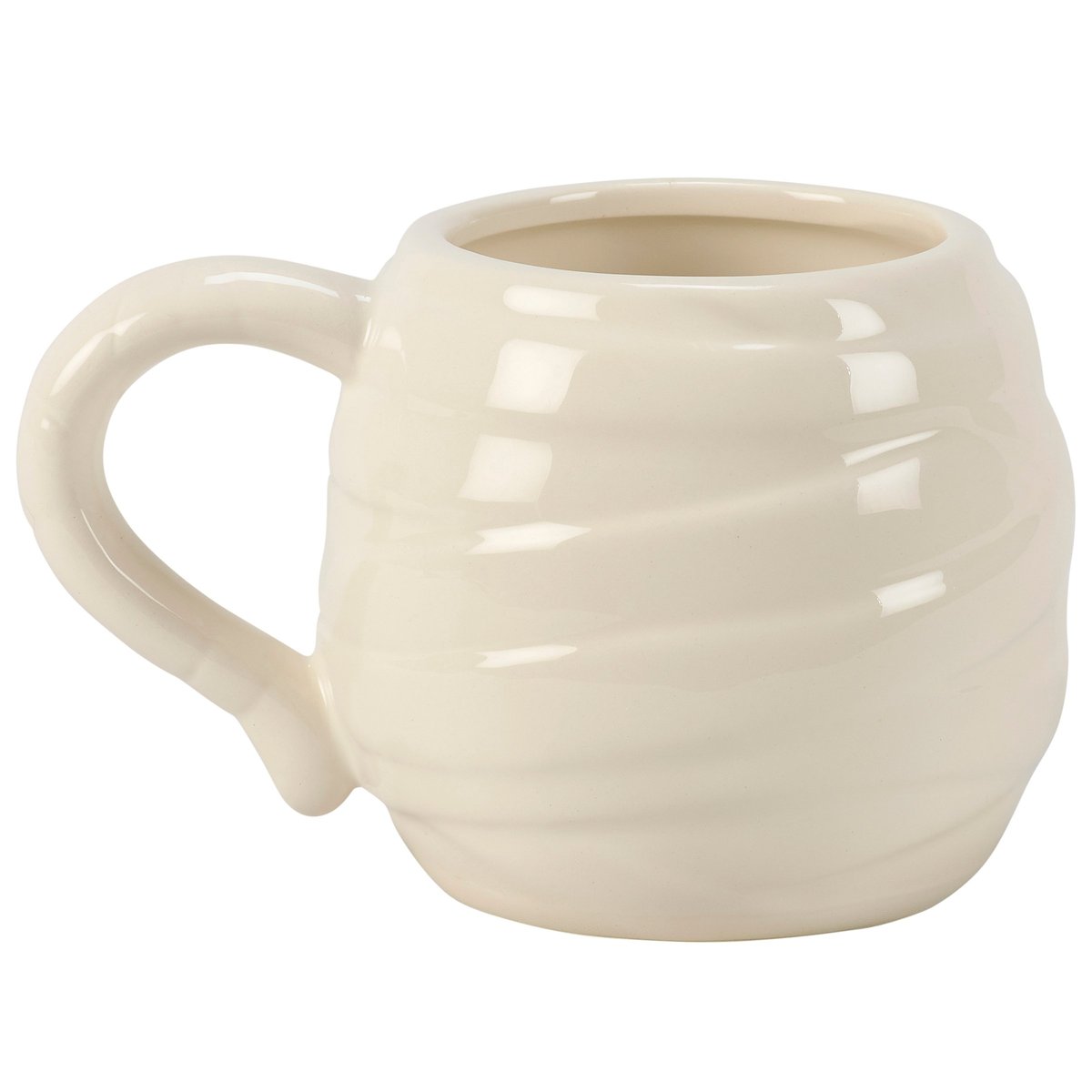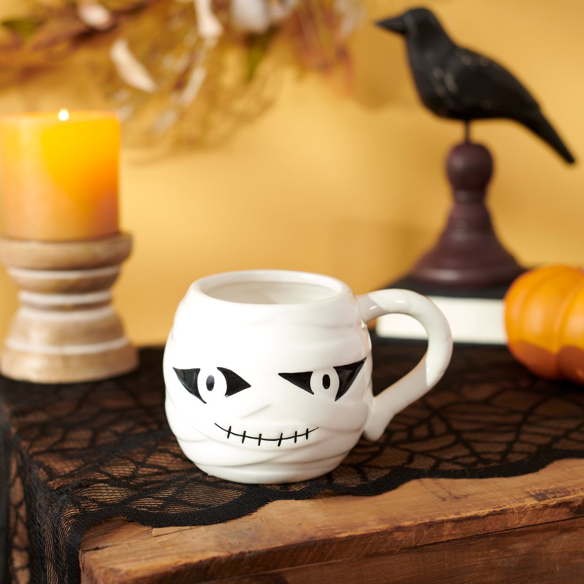 A ceramic 16 oz mug from our Halloween Collection displaying a fun sculpted mummy head design with glaze finish and mummy wrap for the handle as well as an opening on top for drinking. Hand wash only. Our Mummy mug is a fun Halloween gift perfect for seasonal drinkware.
