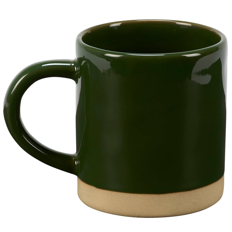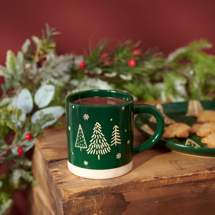 A stoneware 16 oz mug from our Christmas Collection displaying a natural green color glaze with debossed winter tree and snowflake designs and raw ceramic accents. Hand wash only. Our Natural Trees mug is a vintage Christmas gift perfect for seasonal drinkware.