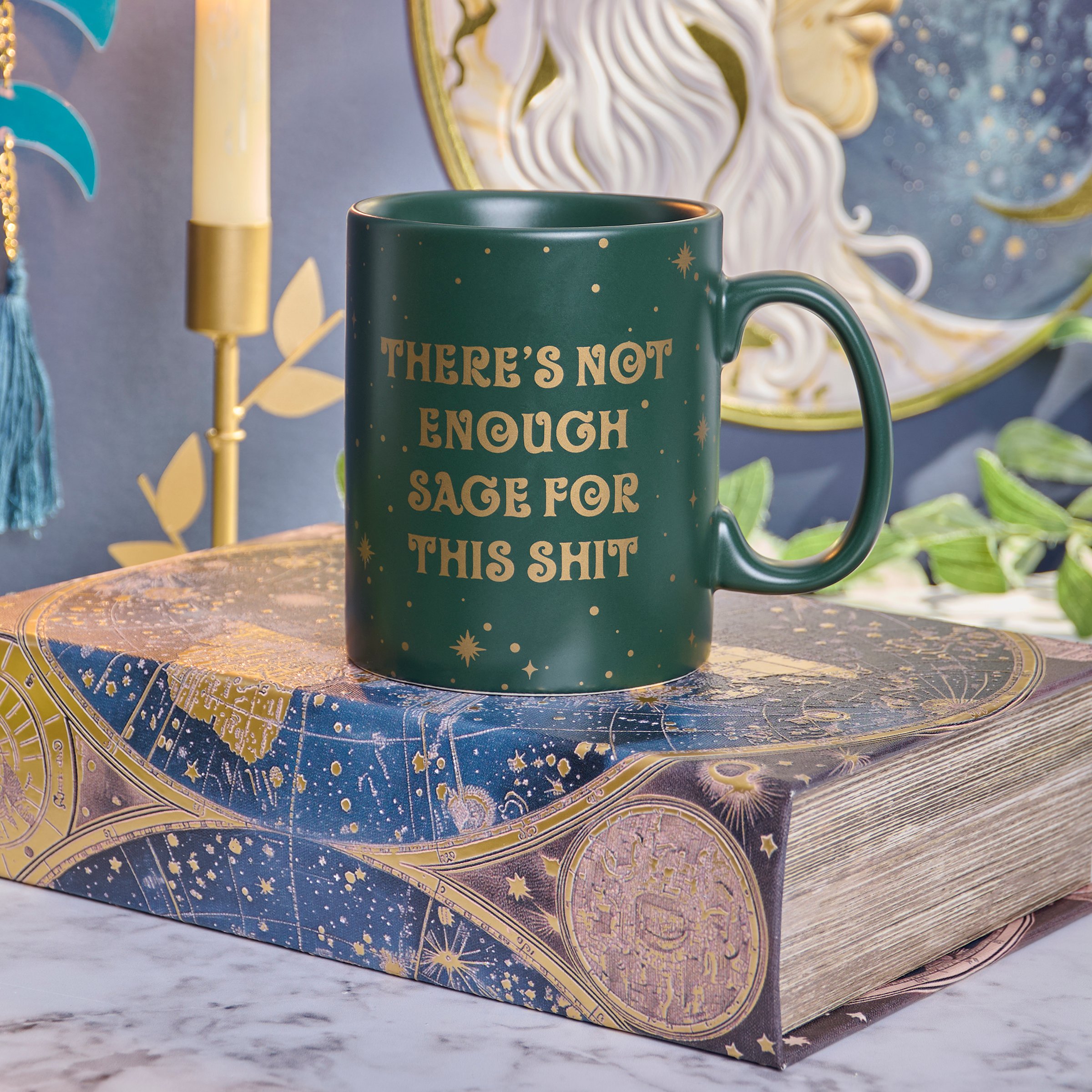 A stoneware 20 oz mug from our Mystical Collection displaying a double-sided design of gold stars around a sassy spiritual sentiment that reads "There's Not Enough Sage For This Shit." Our Not Enough Sage For This mug is conveniently microwave, oven, dishwasher, and food safe for easy use. A sassy celestial themed gift perfect for everyday drinkware.