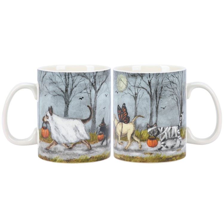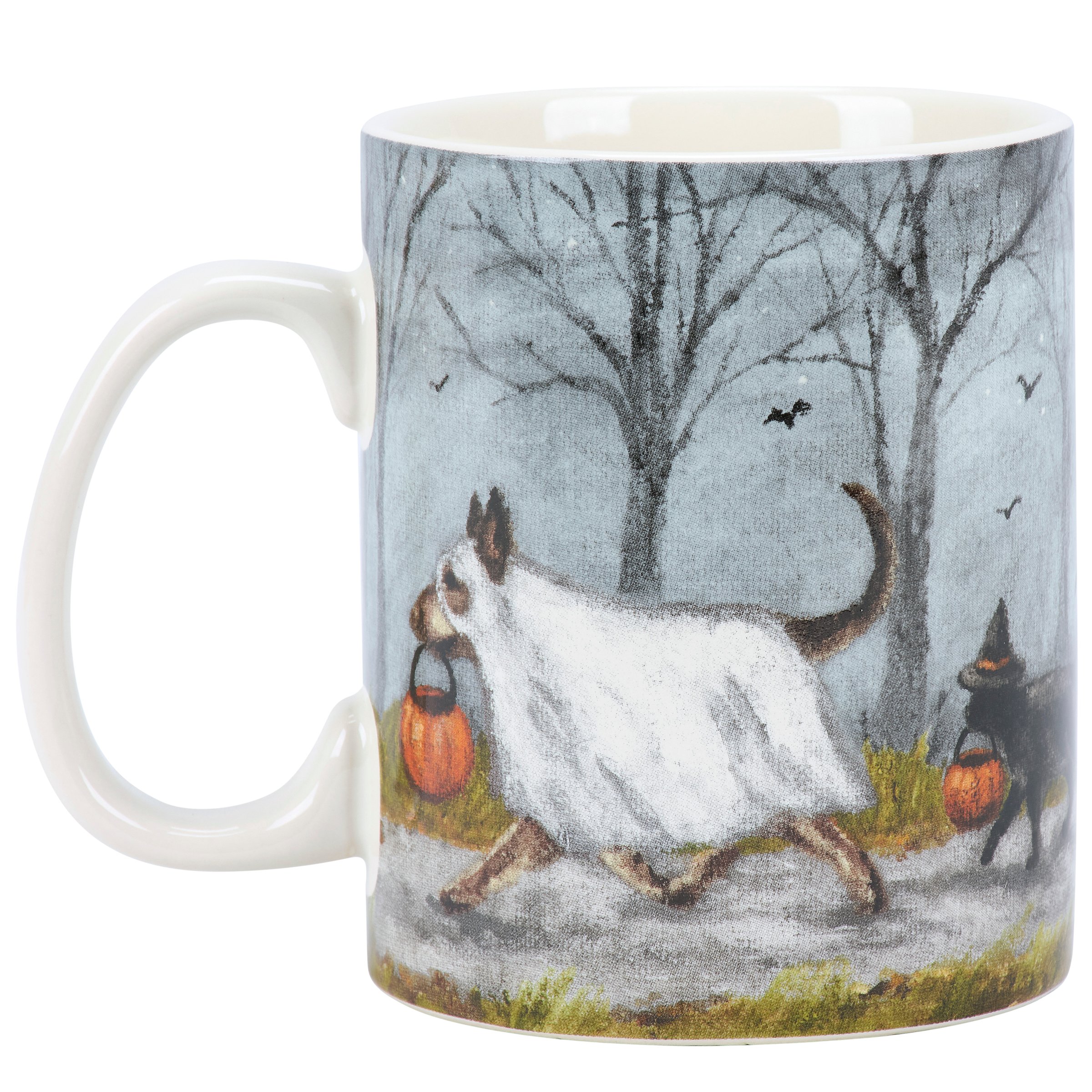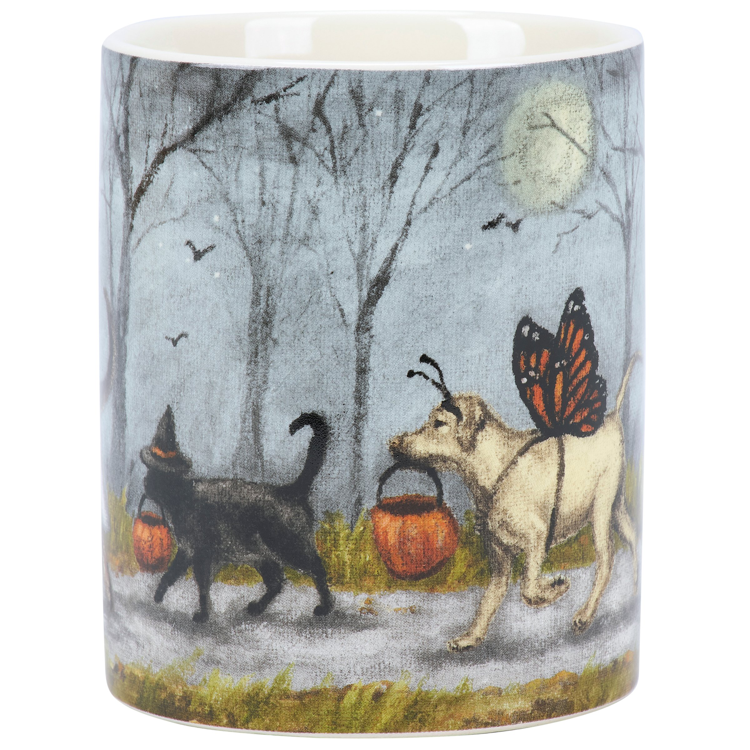 A stoneware 20 oz mug from our Halloween Collection featuring a full wrap-around design displaying a charming scene of pets walking together in Halloween costumes holding treat buckets. Halloween pet design is replicated from original artwork painted onto burlap canvas, giving the art a unique depth and texture. Our Pet Parade mug is conveniently microwave, oven, dishwasher, and food safe for easy use. A fun pet themed gift perfect for seasonal drinkware.