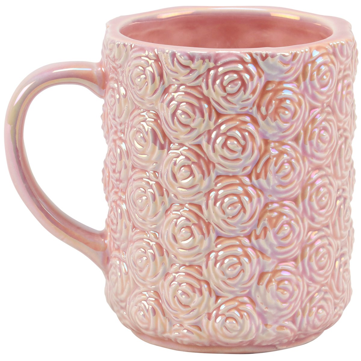 A ceramic 12 oz mug from our Mother's Day Collection displaying a sculpted roses design around the outside with a pink pearlescent glaze finish throughout for added interest. Hand wash only. Our Pink Roses mug is a lovely Mother's Day gift perfect for everyday drinkware.