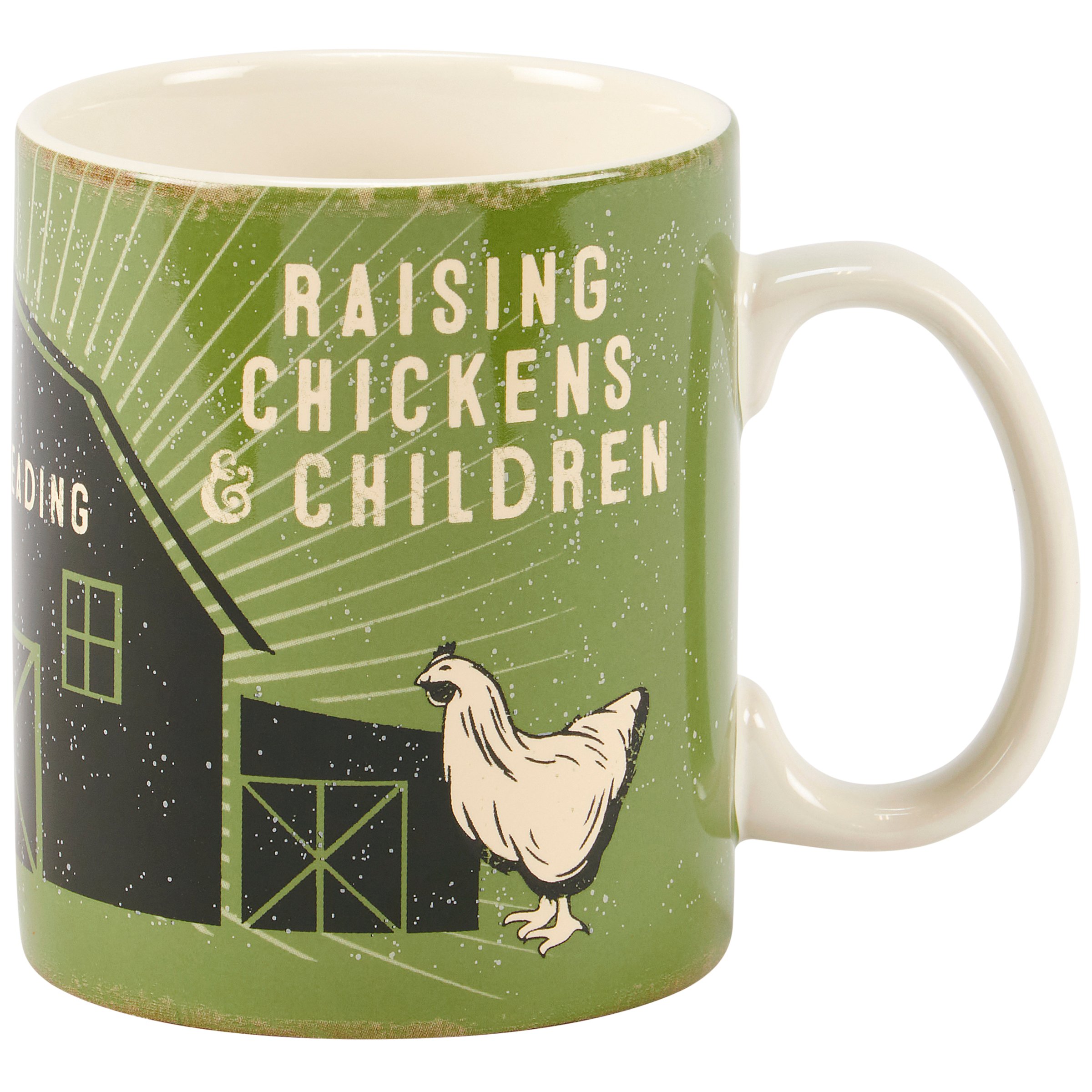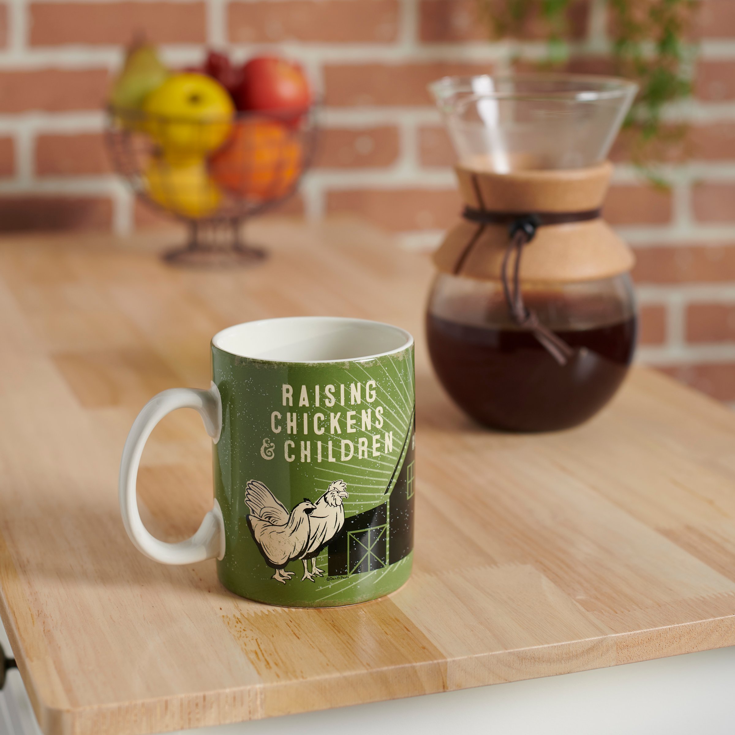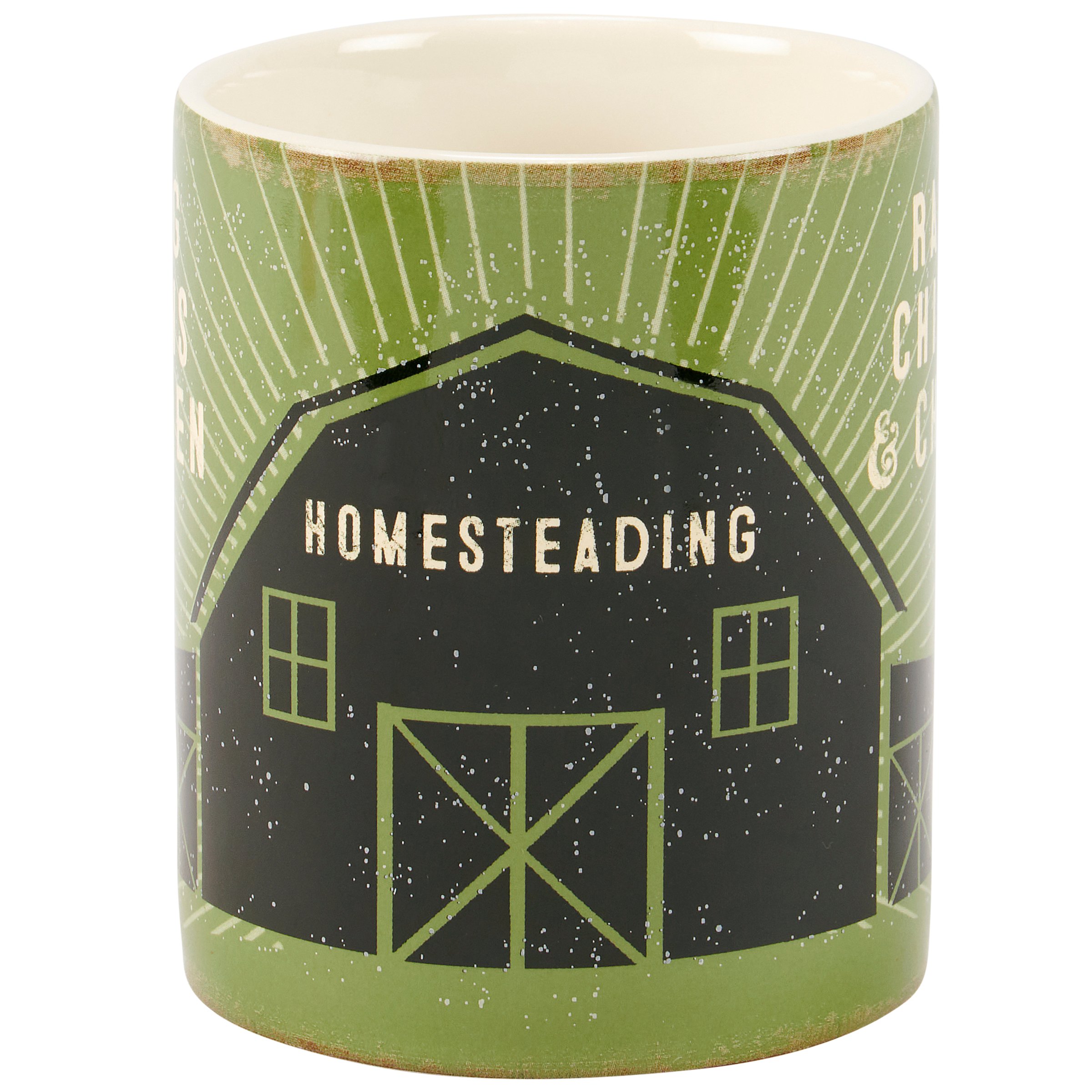A stoneware 20 oz mug from our Homestead Collection displaying a full wrap-around design of a barn and chicken in a rustic style with a fun local farm inspired sentiment that reads "Homesteading - Raising Chickens & Children." Our Raising Chickens mug is conveniently microwave, oven, dishwasher, and food safe for easy use. A fun farm-themed gift perfect for everyday drinkware.