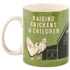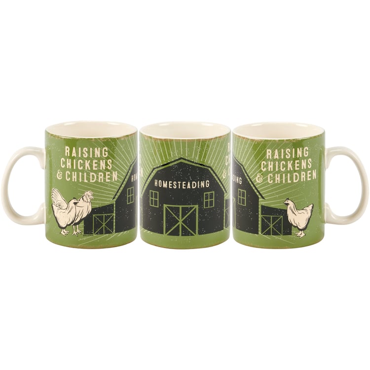 A stoneware 20 oz mug from our Homestead Collection displaying a full wrap-around design of a barn and chicken in a rustic style with a fun local farm inspired sentiment that reads "Homesteading - Raising Chickens & Children." Our Raising Chickens mug is conveniently microwave, oven, dishwasher, and food safe for easy use. A fun farm-themed gift perfect for everyday drinkware.