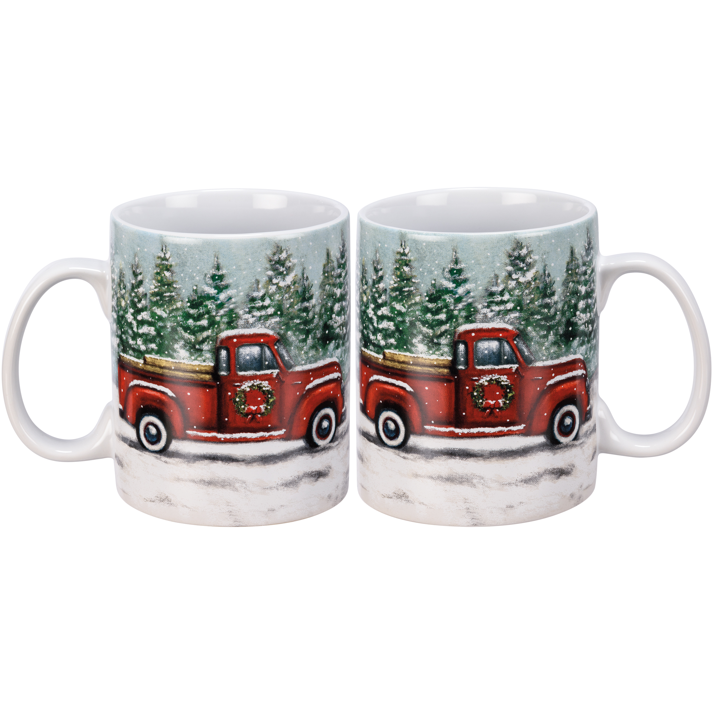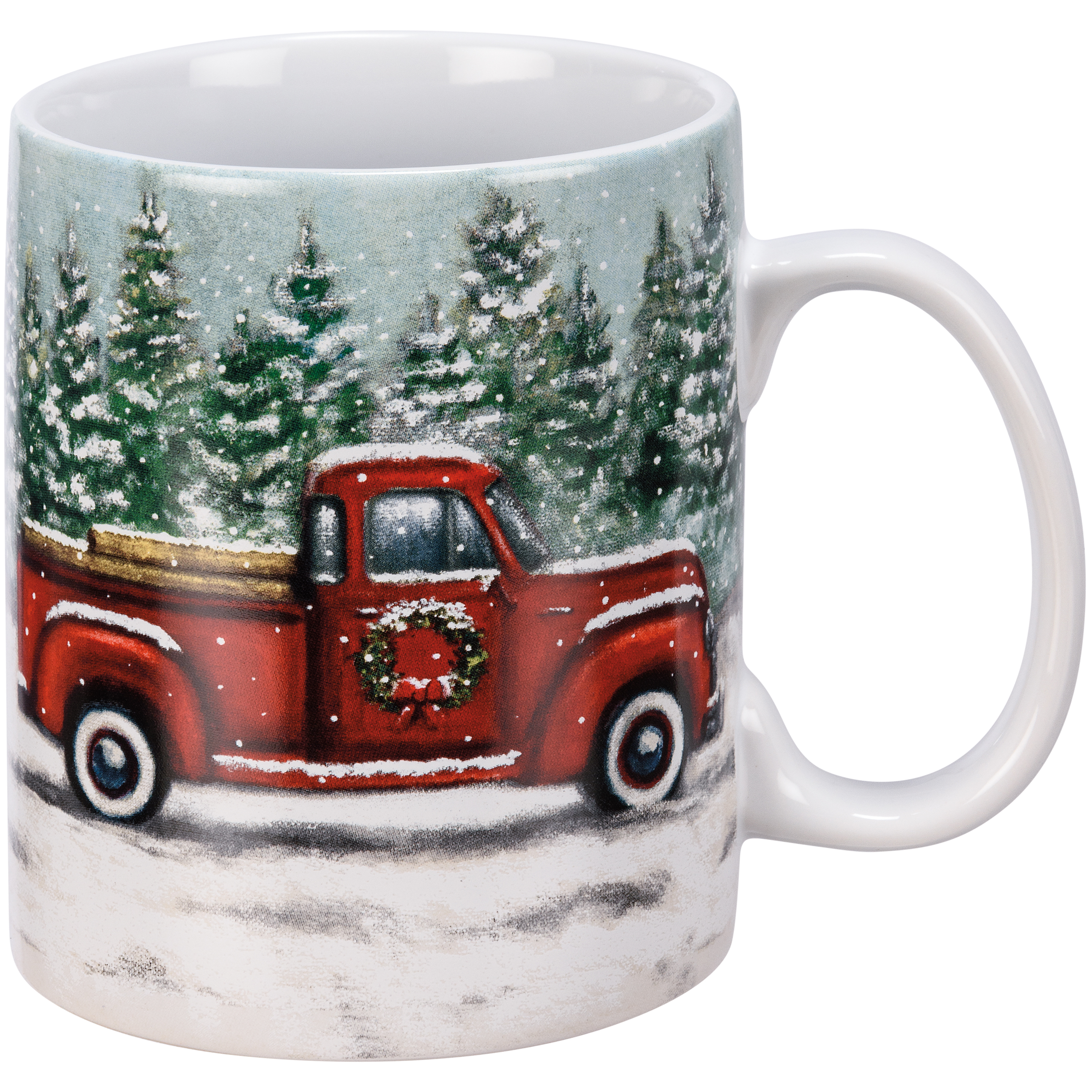 A stoneware mug featuring a full wrap-around winter red truck design. Design is replicated from original artwork painted onto burlap canvas, giving the art a unique depth and texture. Red Truck mug is microwave, oven, dishwasher and food safe. Holds 20 oz.
