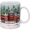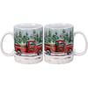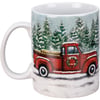 A stoneware mug featuring a full wrap-around winter red truck design. Design is replicated from original artwork painted onto burlap canvas, giving the art a unique depth and texture. Red Truck mug is microwave, oven, dishwasher and food safe. Holds 20 oz.