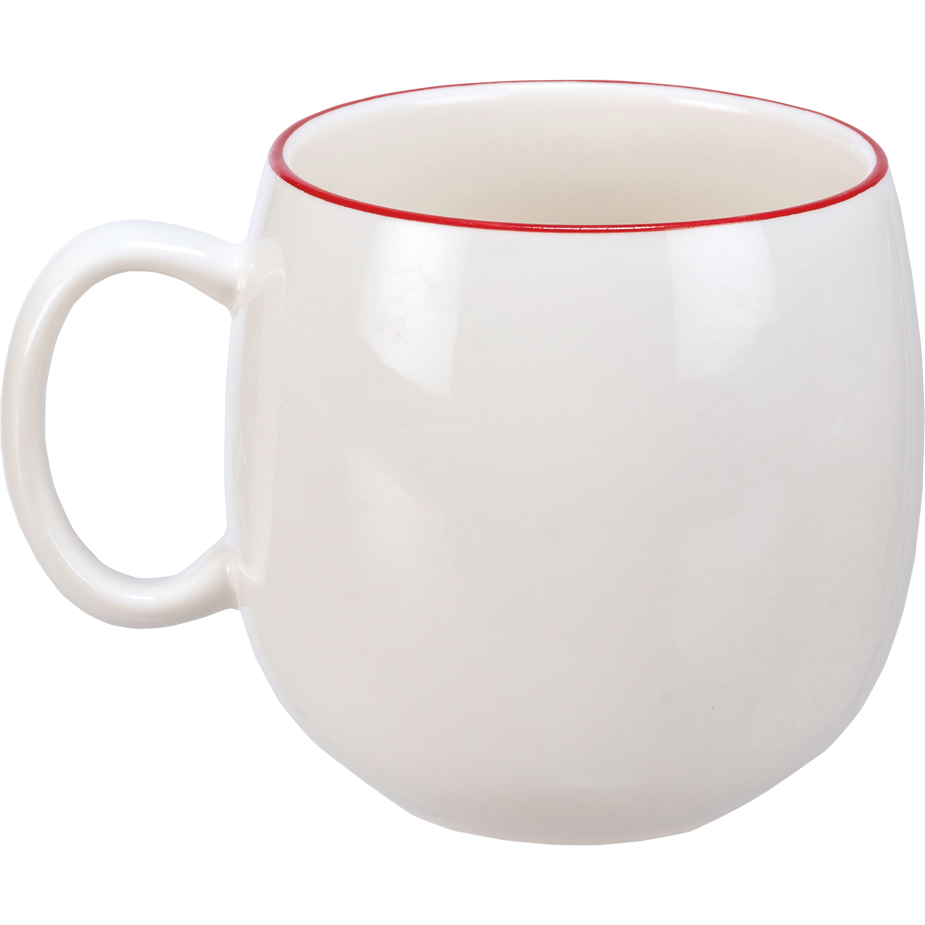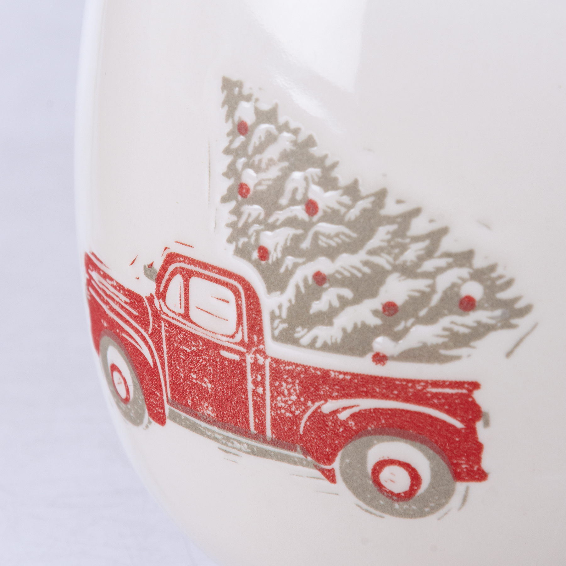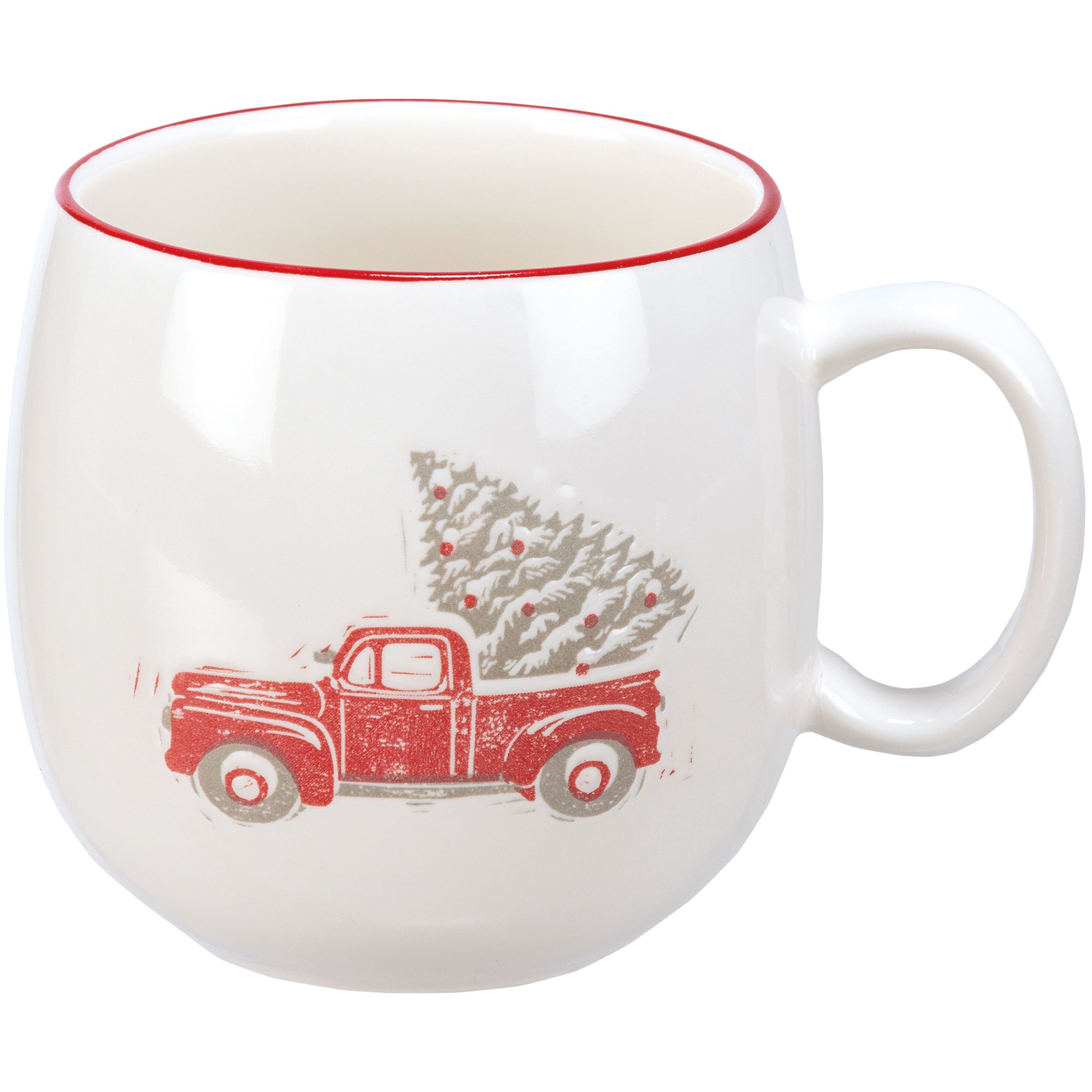 A stoneware mug featuring a debossed red truck and Christmas tree design. Red rim adds interest to design. Red truck mug is microwave, dishwasher, and food safe.