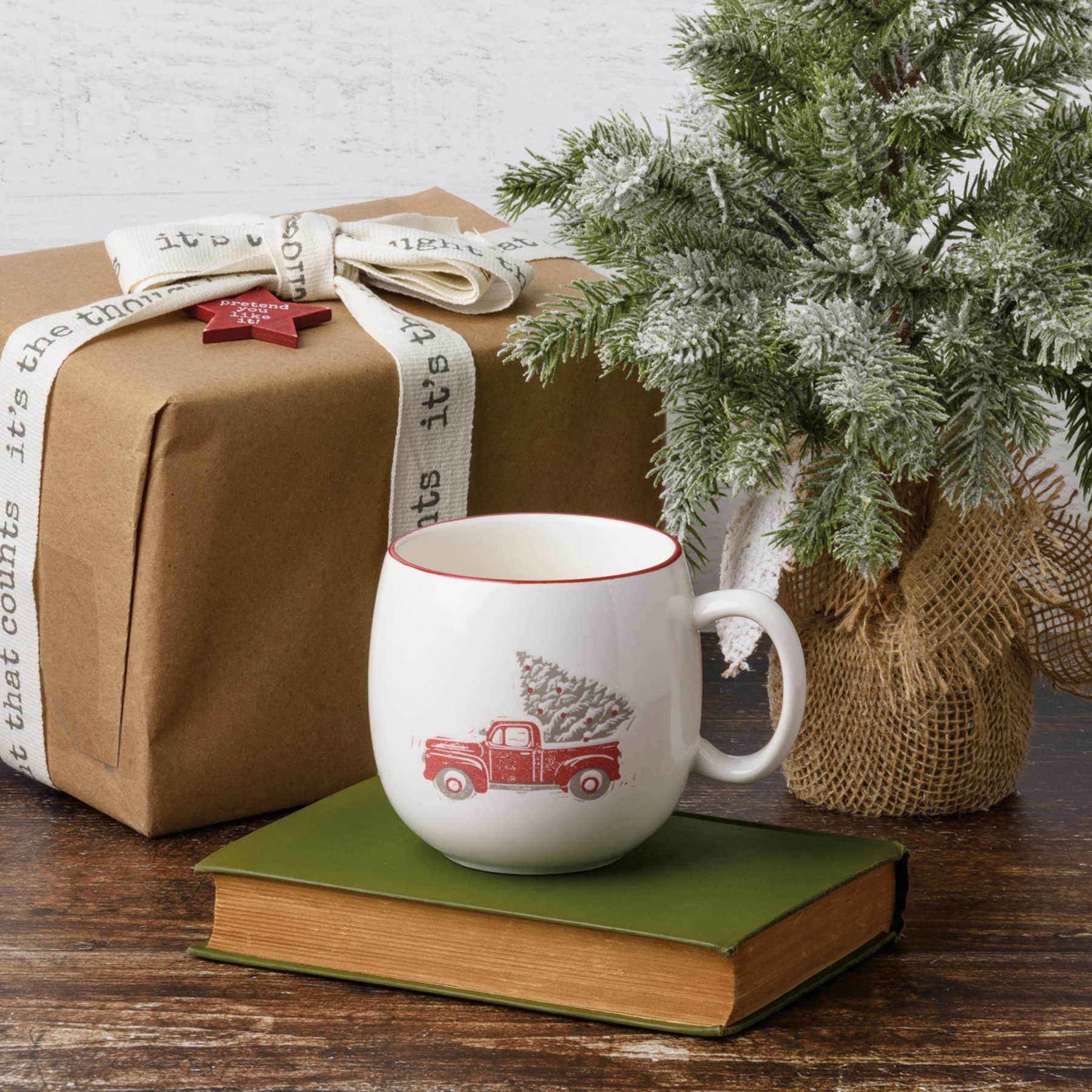 A stoneware mug featuring a debossed red truck and Christmas tree design. Red rim adds interest to design. Red truck mug is microwave, dishwasher, and food safe.