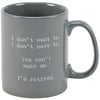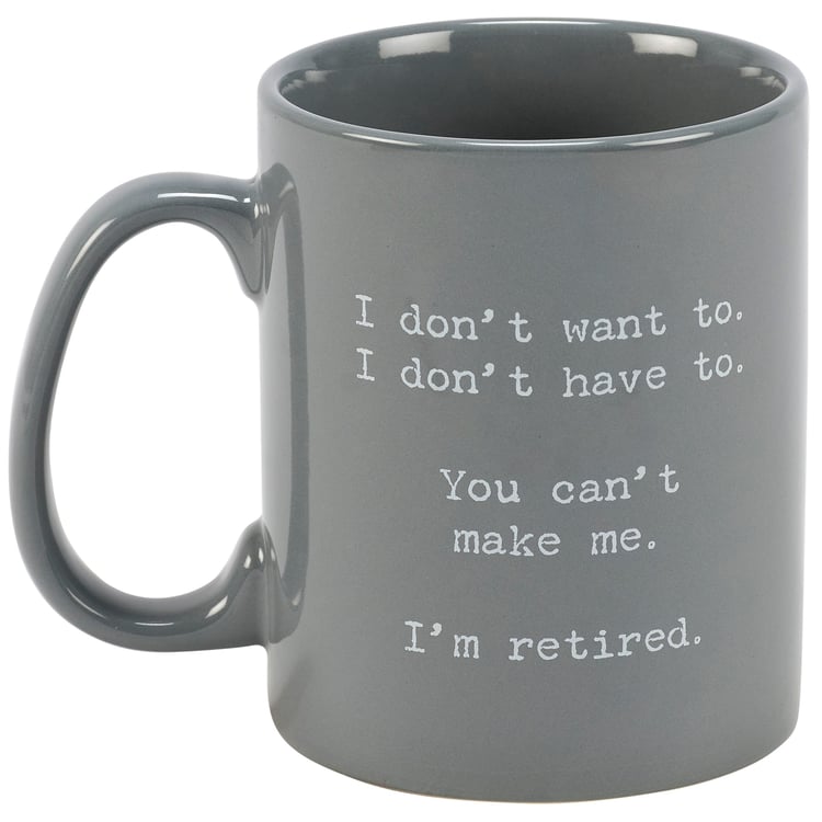A stoneware 20 oz mug from our Trash Talk By Annie Collection displaying a double-sided design of a humorous retirement-themed sentiment in a vintage style. Funny mug sentiment reads "I Don't Want To. I Don't Have To. You Can't Make Me. I'm Retired." Our I'm Retired mug is conveniently microwave, oven, dishwasher, and food safe for easy cleaning and use. A fun vintage style gift perfect for everyday drinkware.