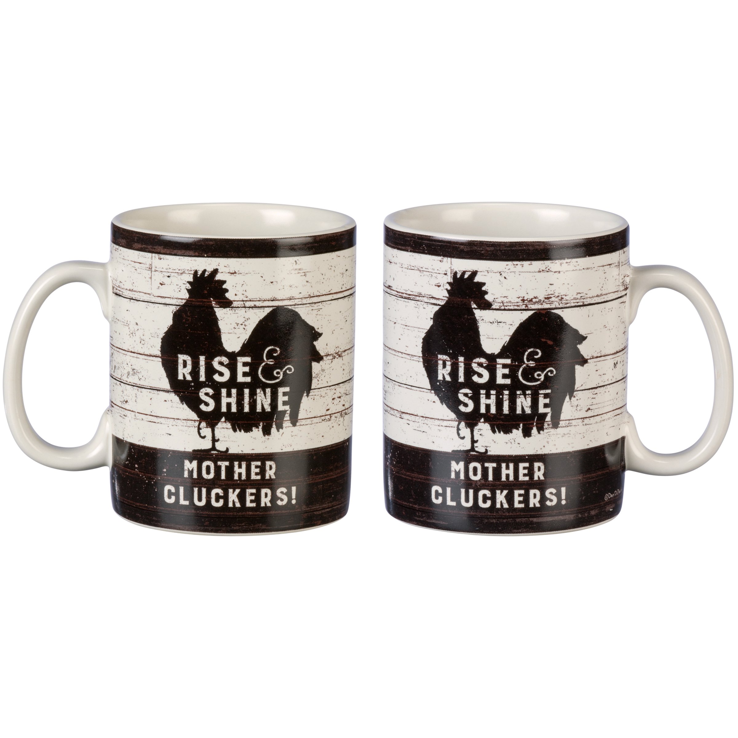 A double-sided stoneware coffee mug lending a double-sided and distressed "Rise & Shine Mother Cluckers!" sentiment with chicken silhouette designs and slatted wood background print. Microwave, oven, dishwasher, and food safe. Holds 20 oz.