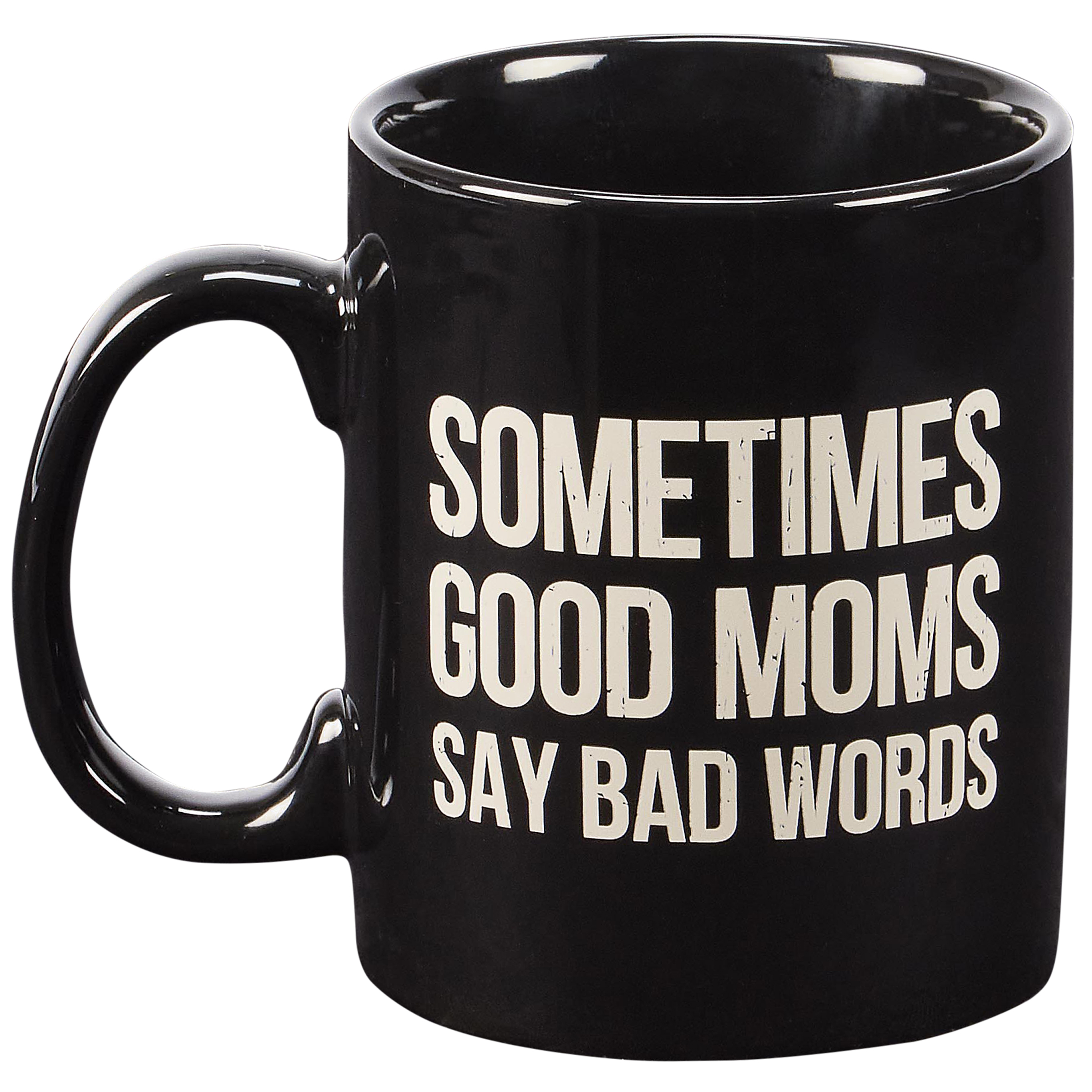 A stoneware 20 oz mug from our Mother's Day Collection displaying a double-sided design of a fun mom inspired sentiment in a classic box sign style that reads "Sometimes Good Moms Say Bad Words." Our Say Bad Words mug is conveniently microwave, oven, dishwasher, and food safe for easy use. A fun Mother's Day gift perfect for everyday drinkware.