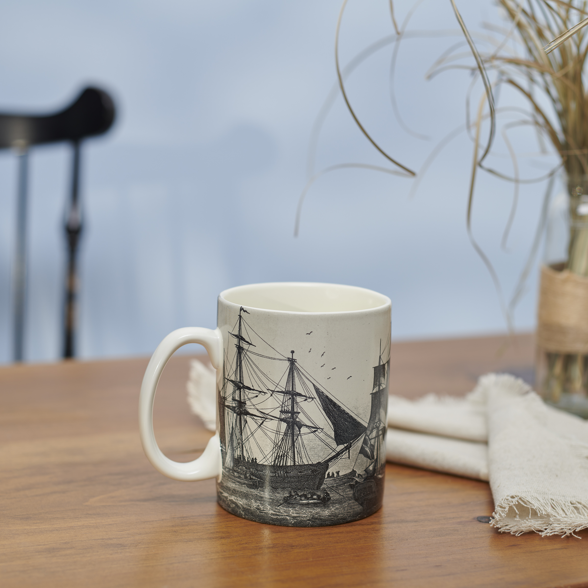 A stoneware 20 oz mug from our Beach Collection displaying a full wrap-around design of vintage art of schooners on the ocean. Our Schooners mug is conveniently microwave, oven, dishwasher, and food safe for easy use. A vintage beach-themed gift perfect for everyday drinkware.
