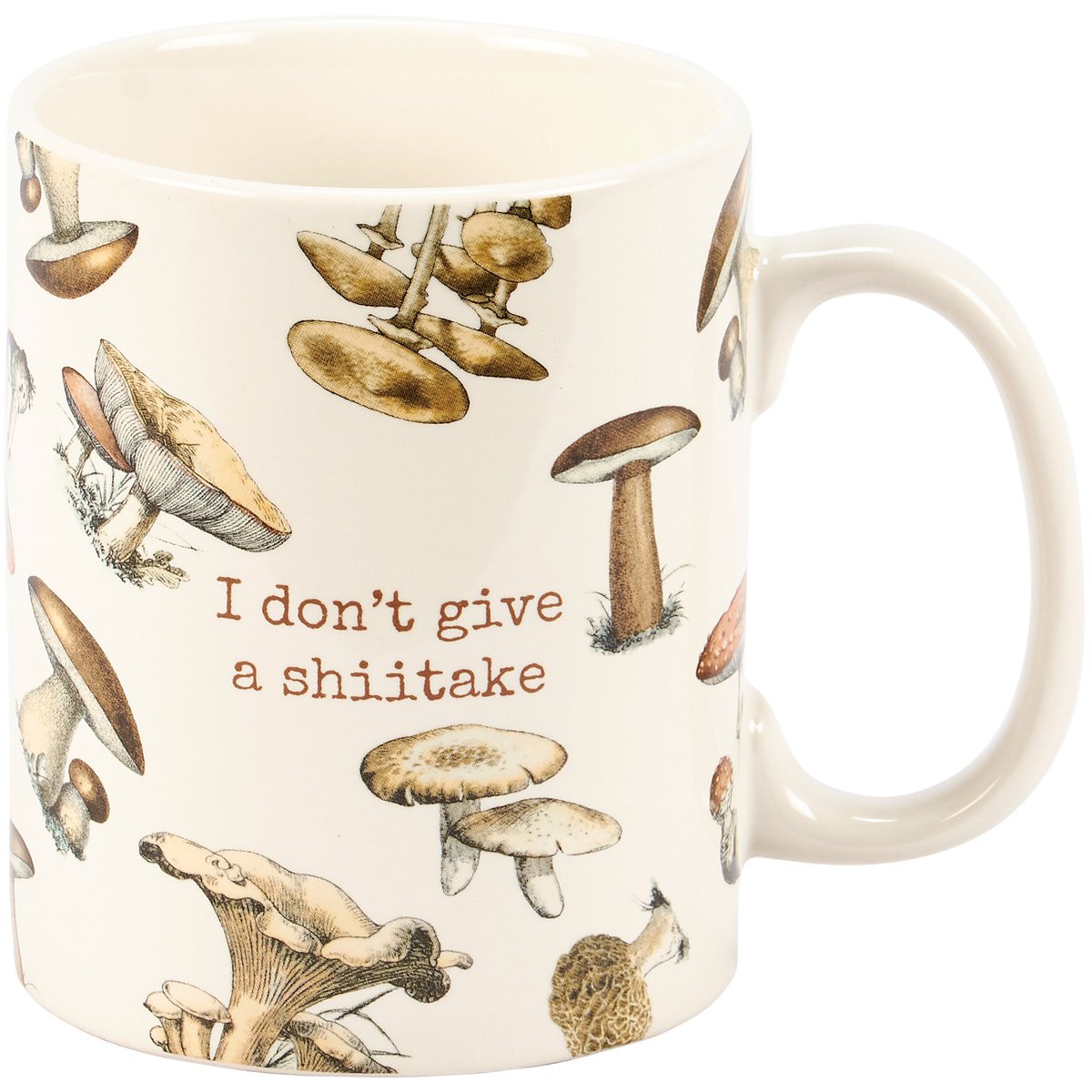 A stoneware 20 oz mug from our Garden Collection displaying a full wrap-around design of various wild mushrooms in a vintage style. Design also features a fun garden-themed pun that reads "I Don't Give A Shiitake." Our Shiitake mug is conveniently microwave, oven, dishwasher, and food safe for easy use. A fun garden-themed gift perfect for everyday drinkware.