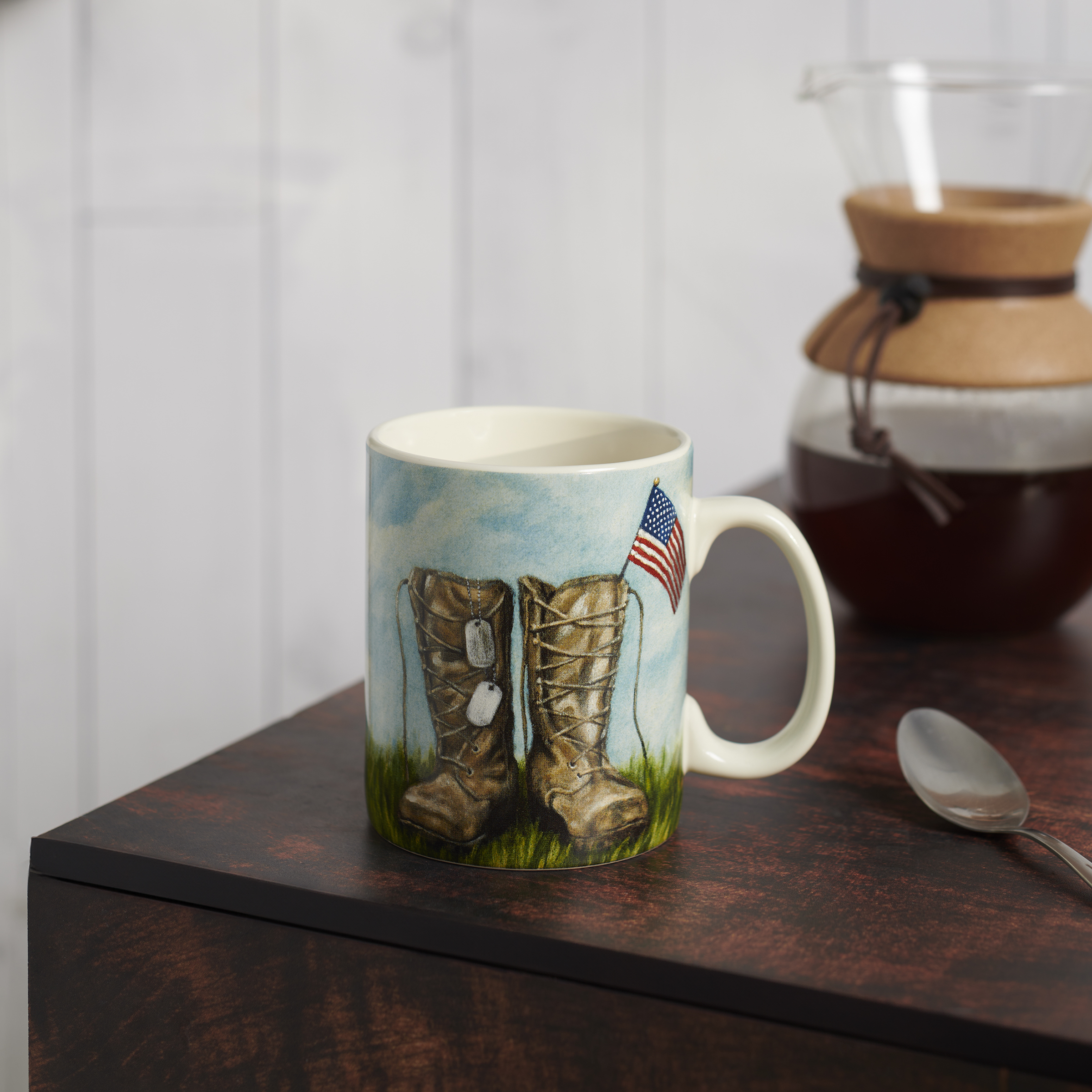 A stoneware 20 oz mug from our Patriotic Collection displaying a double-sided design of a pair of soldiers boots with dog tags and an American flag on them. Patriotic soldier design is replicated from original artwork painted onto burlap canvas, giving the art a unique depth and texture. Our Soldier's Boots mug is conveniently microwave, oven, dishwasher, and food safe for easy use. A patriotic mug perfect for everyday drinkware.