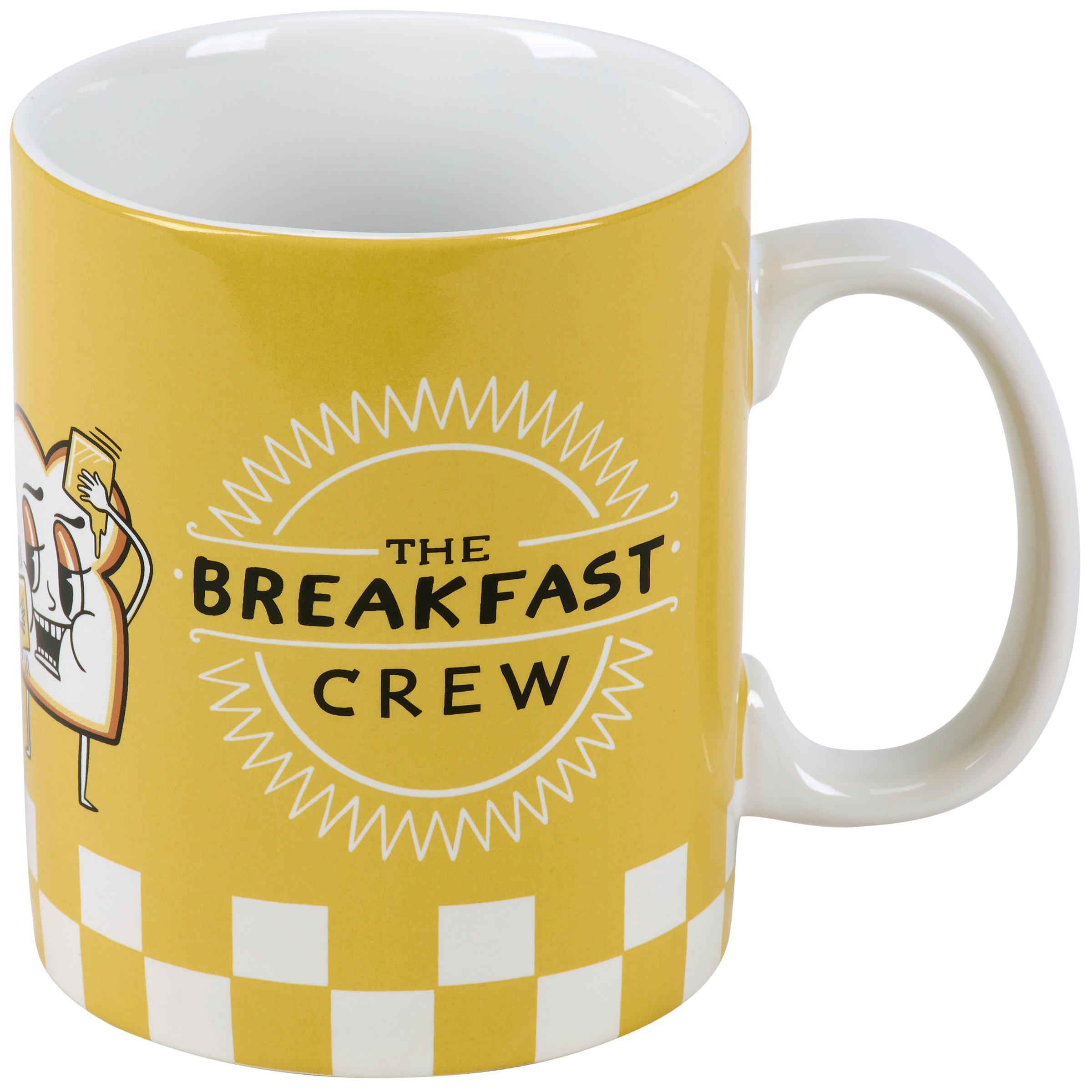 A stoneware 20 oz mug from our LOL-Made You Smile Collection featuring a full wrap-around design of fun breakfast food characters with a food inspired sentiment that reads "The Breakfast Crew." Food character designs and sentiment is replicated from original hand illustrated art in a fun retro style. Our Breakfast Crew mug is conveniently microwave, oven, dishwasher, and food safe for easy use. A fun food-themed gift perfect for everyday drinkware.