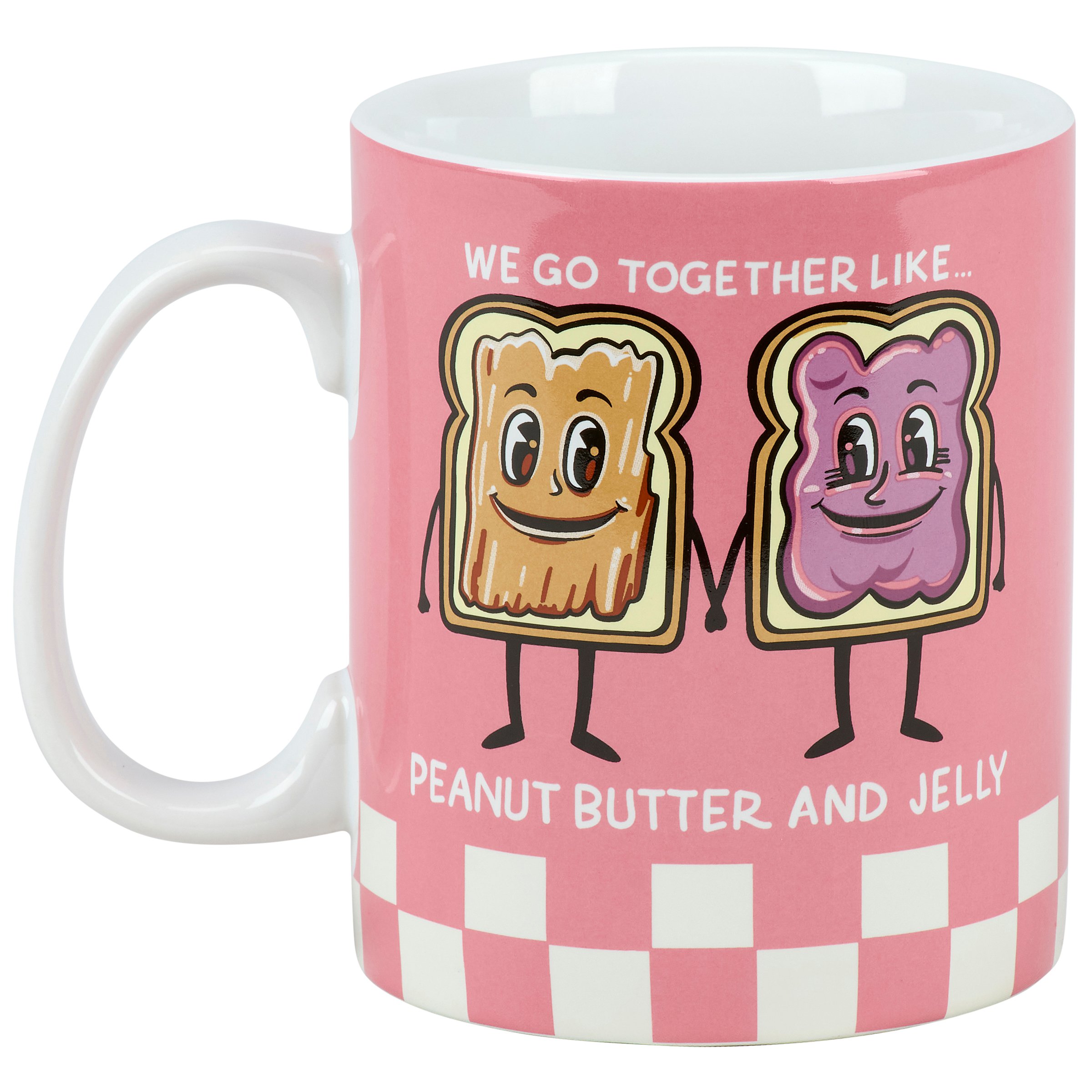 A stoneware 20 oz mug from our Valentine's Day Collection featuring a double-sided design displaying a hand illustrated peanut butter and jelly couple in a fun retro style with a food-themed sentiment that reads "We Go Together Like... Peanut Butter And Jelly." Our Together Like Peanut Butter And Jelly mug is conveniently microwave, oven, dishwasher, and food safe for easy use. A food-themed gift perfect for both friends and partners on Valentine's Day or as fun love-themed drinkware in everyday moments.