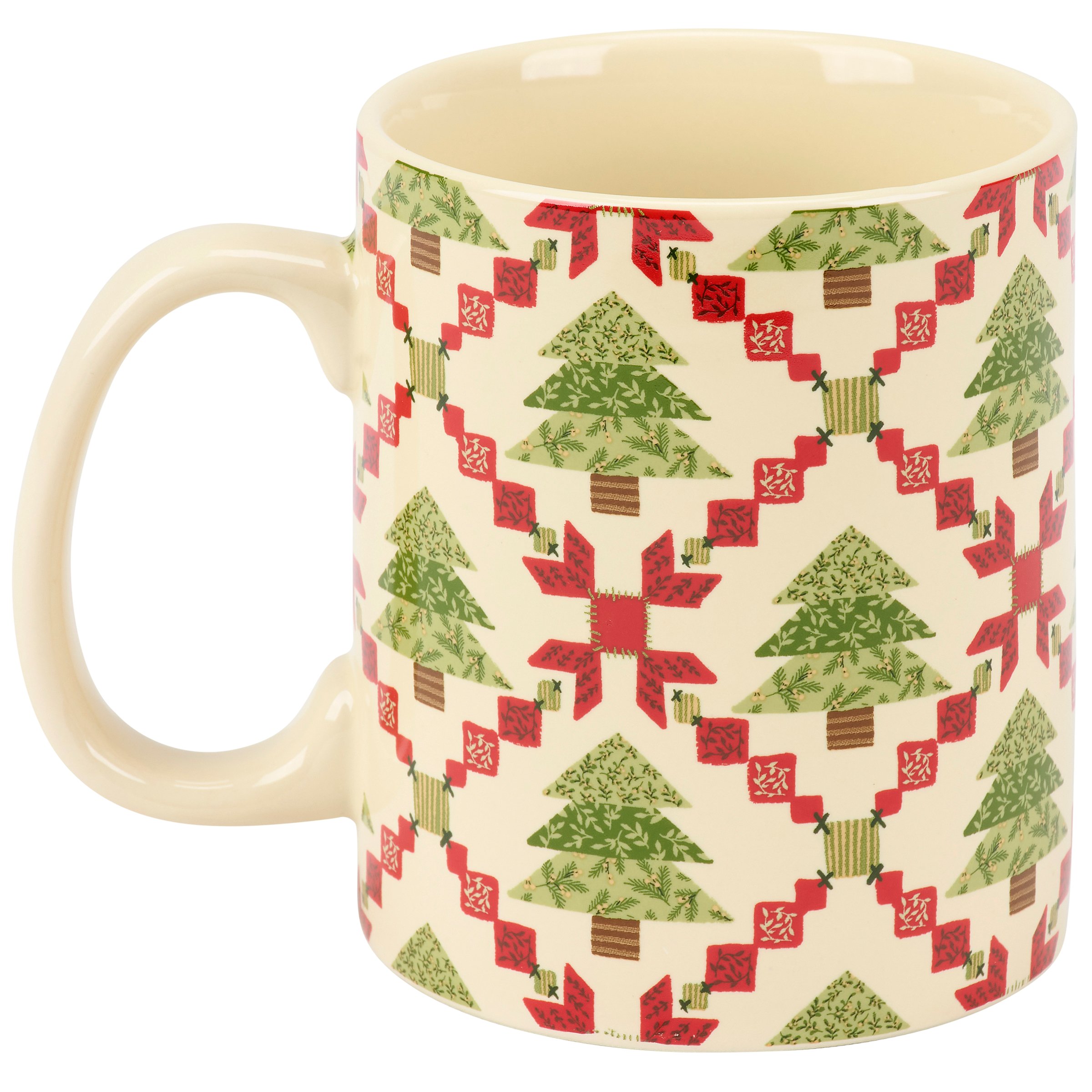A stoneware 20 oz mug from our Christmas Collection featuring a full wrap-around design displaying a Christmas tree quilt inspired craft pattern. Christmas tree quilt design is replicated from original art hand painted in a unique watercolor style. Our Tree Quilt mug is conveniently microwave, oven, dishwasher, and food safe for easy use. A craft themed Christmas gift perfect for seasonal drinkware.